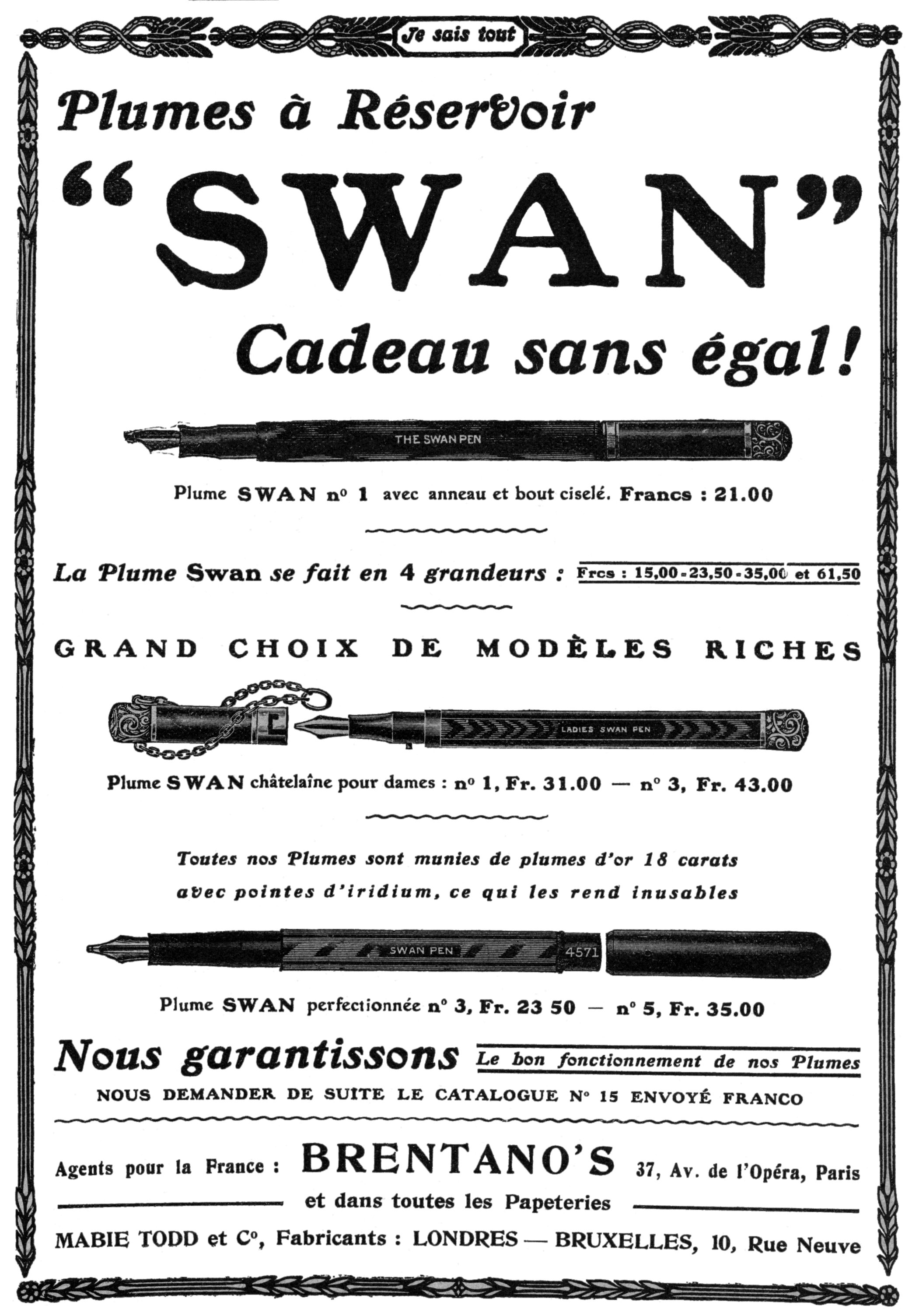 Scansione di una pubblicità Swan datata 1909. Pubblicazione su: L'Illustration. Ritoccata dall'autore per una migliore nitidezza. Contributo di Armando Dabbene (utente forum fountainpen.it A Dabbene). Data indicata dal fornitore. Pubblicizza vari modelli Swan Pen con caricamento a contagocce e alimentatore overfeed, uno dei quali numerato 4571.