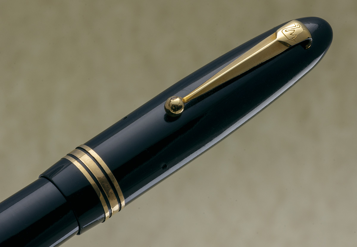 Photo of a pen produced by Swan. Model: Leverless Pen. Filling system: "Leverless". In black celluloid. Detail of cap. Model marked 2060, post-war streamlined version, #4 nib.