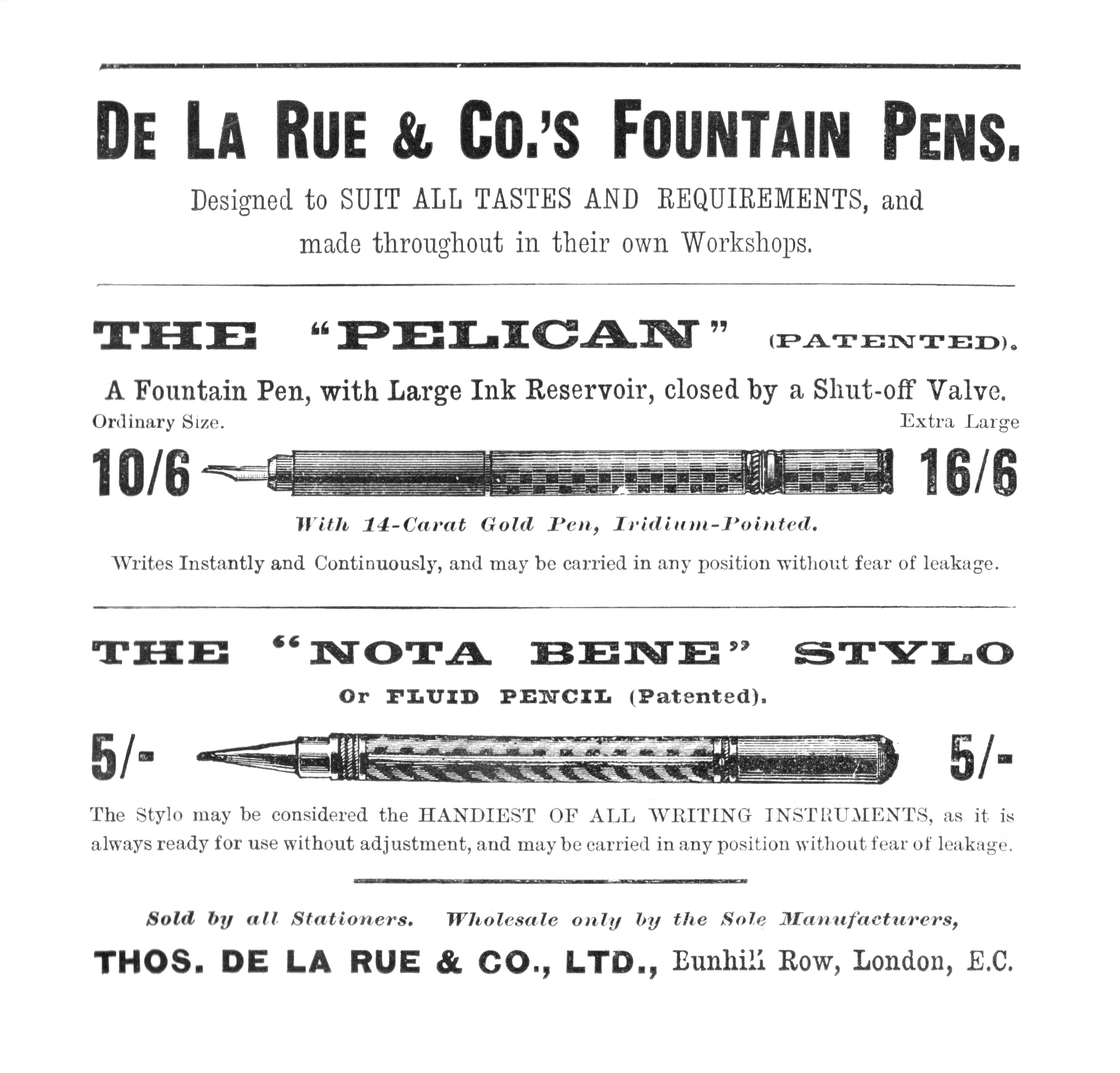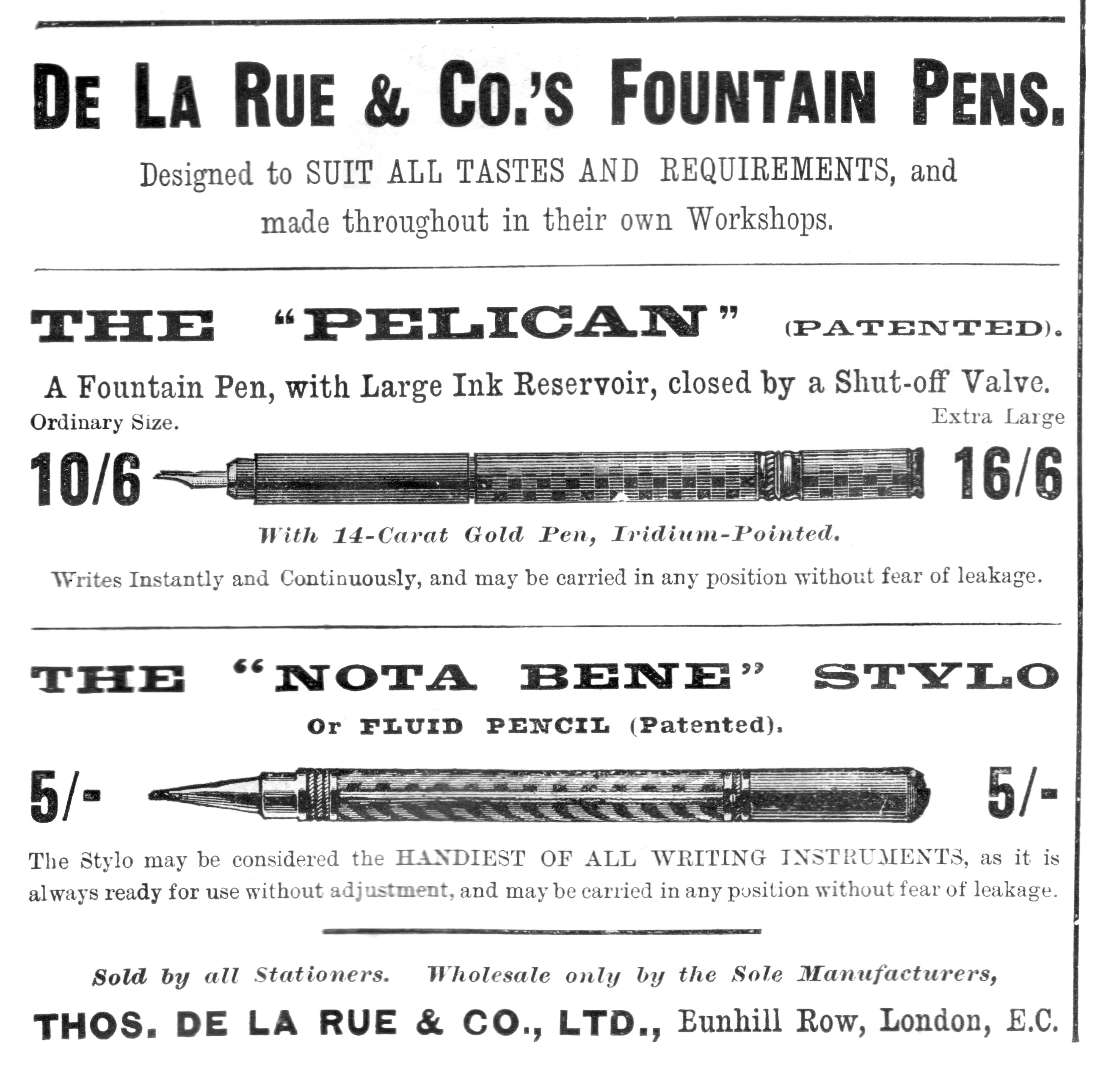 Scansione di una pubblicità Onoto datata 1900-07-04. Pubblicazione su: The Sketch. Indica come indirizzo: "Bunhill Row, London, EC". Ritoccata dall'autore per una migliore nitidezza. Contributo di Giorgio (utente forum Musicus). Data riportata su una sezione non inclusa nell'immagine. Pubblicizza una stilografica Pelican ed una penna a stilo chiamata Nota Bene.
