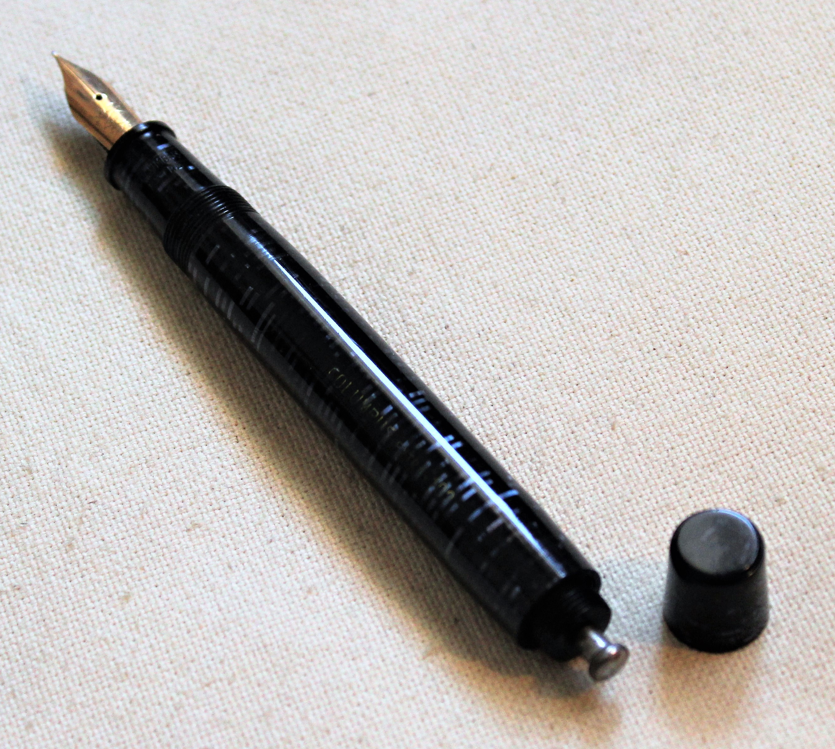 Photo of a pen produced by Columbus. Model: Columbus Extra 102. Filling system: plunger filler. In blue ringed celluloid.