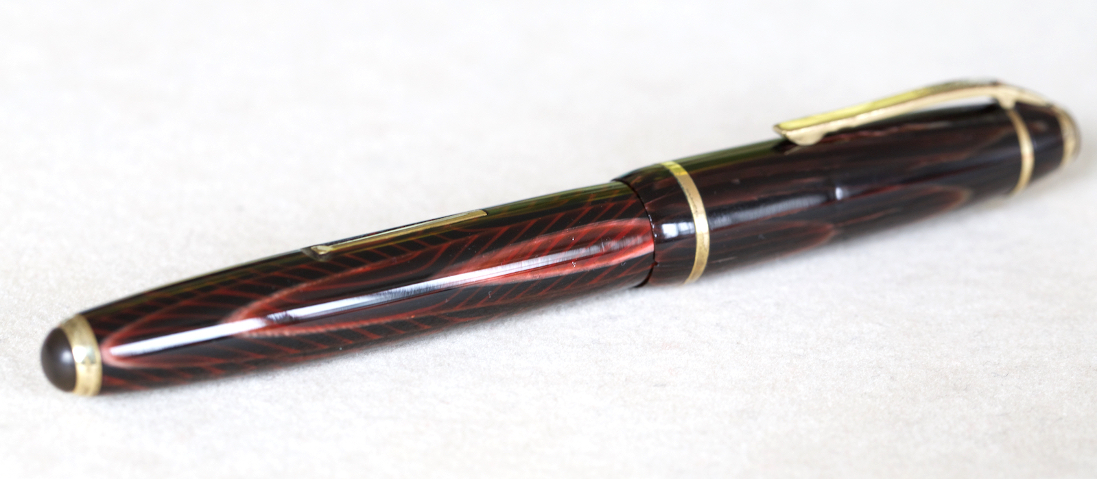 Foto di una penna Columbus. Modello: Columbus 134. Caricamento a levetta. Realizzazione in celluloide rossa simil arco. Contributo di Luca (utente forum LucaC).