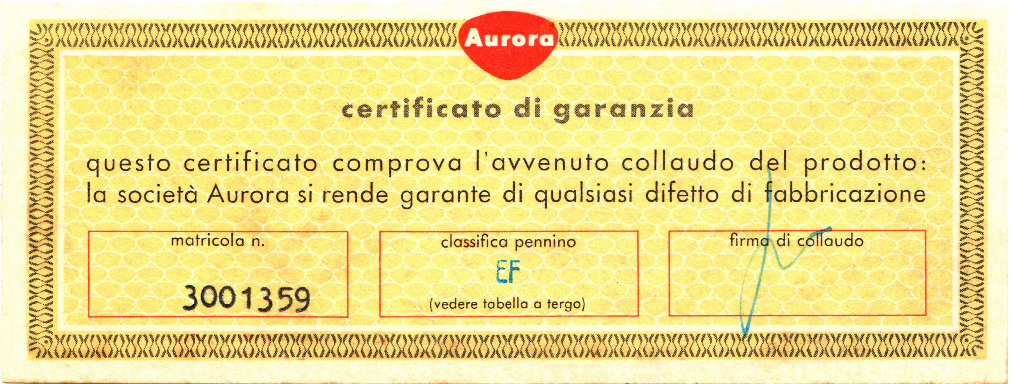 Scansione di un foglietto di garanzia Aurora degli anni '50. Relativo ad un modello Aurora 88P. Fronte, lato della garanzia, matricola 3001359. Sull'altro lato di File:195x-Aurora-88P-Warranty-Back.jpg. Ritoccata dall'autore per una migliore nitidezza. Da una confezione originale.