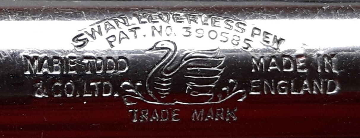 Foto di una penna Swan. Modello: Leverless 2060. Caricamento "Leverless". Realizzazione in celluloide nera. Dettaglio della stampigliatura. Modello marcato 2060, versione affusolata del dopoguerra, pennino #6. Riporta stampigliatura del brevetto nº GB-390585. Contributo di Giorgio (utente forum Musicus).