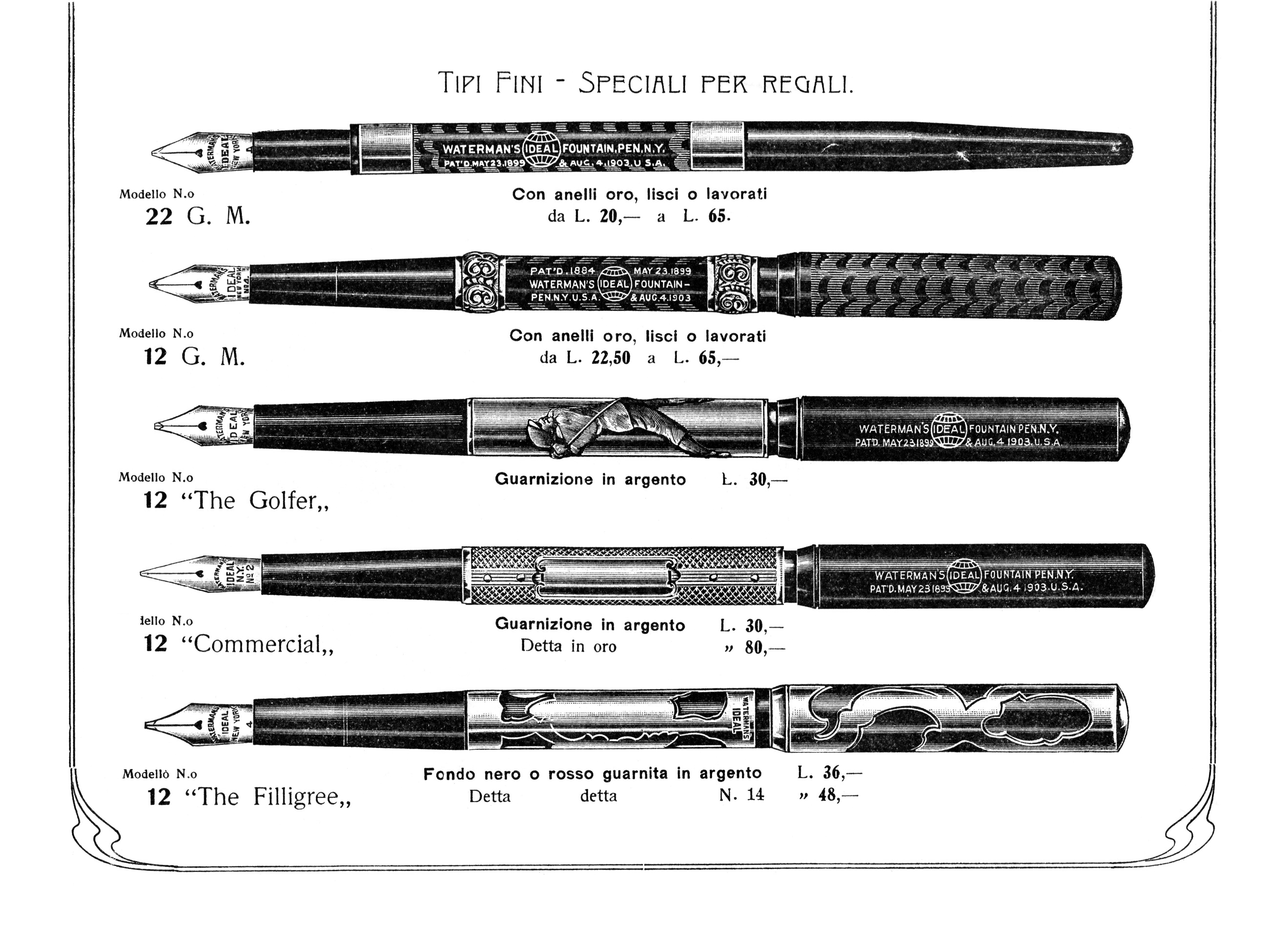 | − | |Note_en=but earlier than 1914, when Cav. Drisaldi became the [[Waterman]] agent in Italy. Right internal page. Advertising for model of that time: [[Waterman 12]] and [[Waterman 22]] with different decorations. {{OnBack|File: | ||