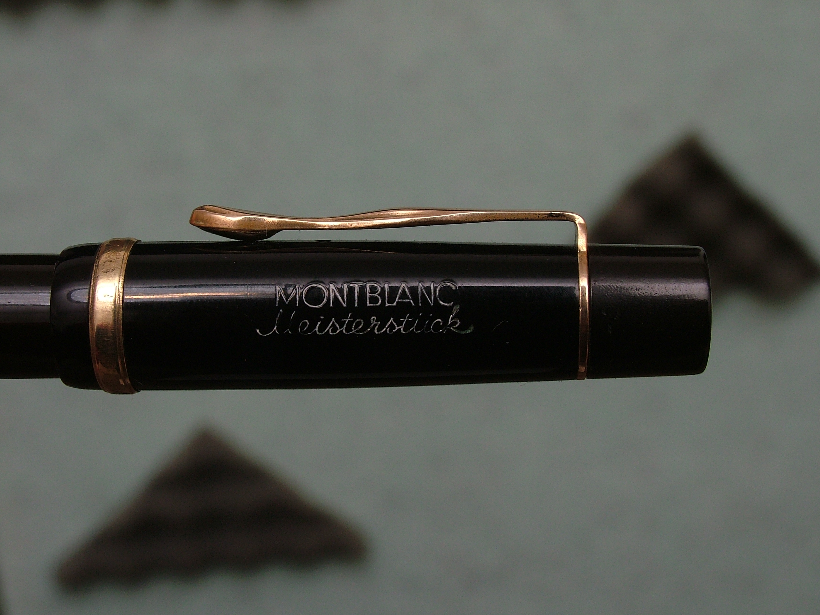 Foto di una penna Montblanc marcata "Meisterstück". Modello: Montblanc 134. Caricamento a stantuffo. Realizzazione in celluloide nera. Dettaglio del cappuccio. Dettaglio della stampigliatura. Versione standard del tempo di guerra con pennino in acciaio. Contributo di Massimo (utente forum maxpop55).