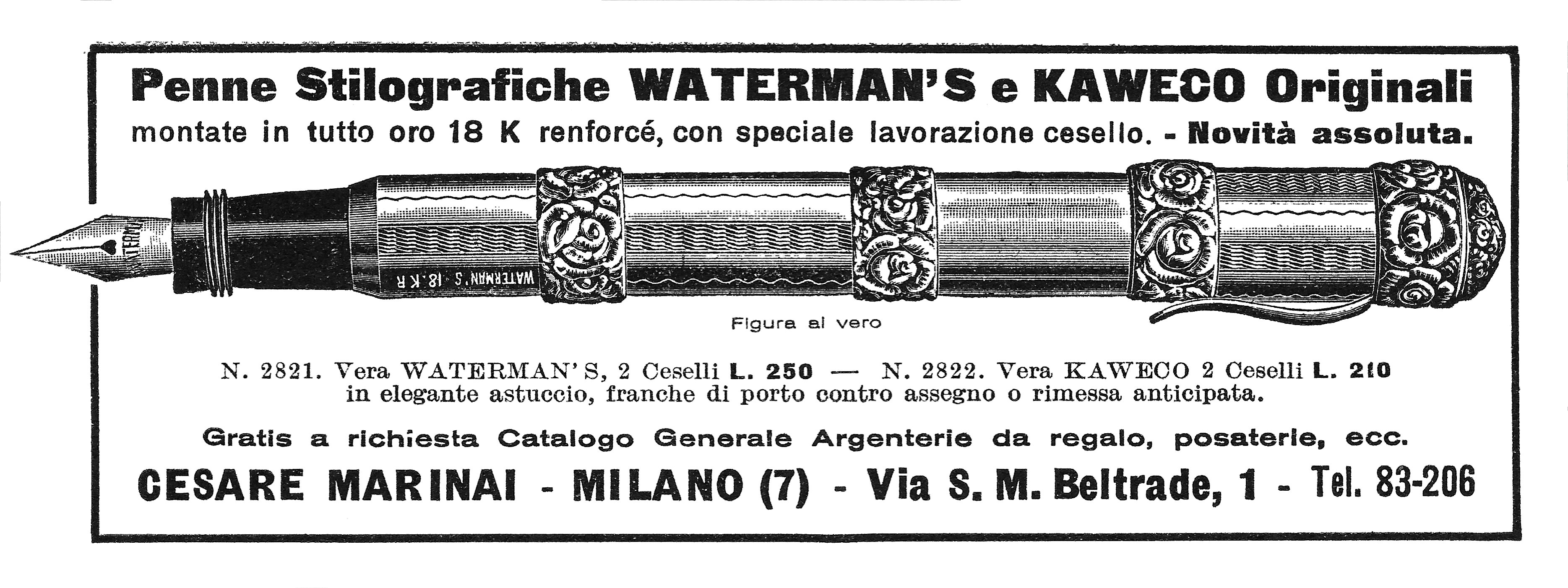 Scansione di una pubblicità datata 1926-01. Pubblicazione su: Le vie d'Italia - Rivista mensile del Touring Club Italiano, anno XXXII, n. 1. Ritoccata dall'autore per una migliore nitidezza. Data dal reperimento della pagina su una versione archiviata della rivista. Pubblicizza una Waterman 42 con rivestimento in oro a cura del venditore e cita la possibilità di una analoga produzione per un modello Kaweco.