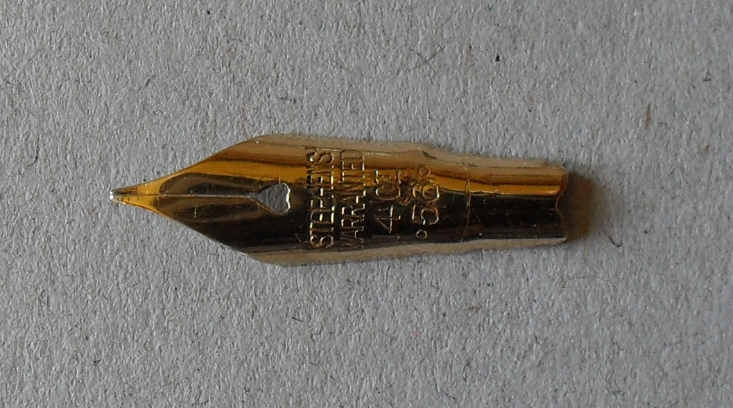 Foto di una penna Stephens. Modello: Stephens Leverfil 56. Caricamento a levetta. Realizzazione in celluloide marmorizzata blu/nera. Dettaglio del pennino. Contributo di Alberto (utente forum A Casirati).