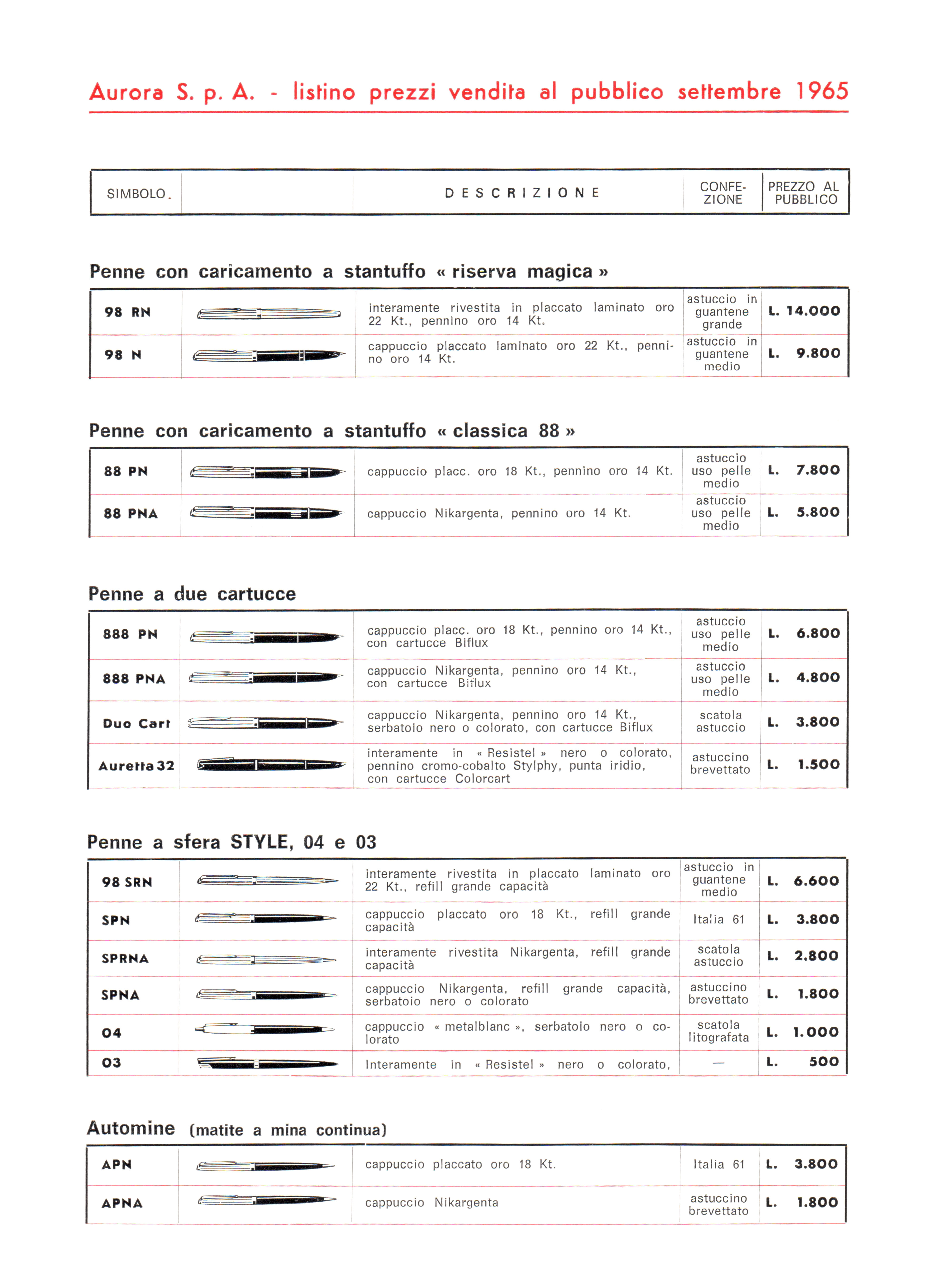|Note_en=Second page. September 1965 retail price list. Inside left page, lists prices of fountain pens, ballpoint ([[Aurora Style]] and mechanical pencils ([[Automina]]). Are listed [[piston filler]] models: [[Aurora 98]] [[Riserva Magica]] in fully laminated 22 Kt gold listed as ''"98 RN"'' and with 22 Kt laminated gold plated cap listed as ''"98 N"''; [[Aurora 88P]] with 18 Kt laminated gold cap, referred to as ''"88 PN"'' and with [[Nikargenta]] cap referred as ''"88 PNA"''. The cartridge models: [[Aurora 888P]] with 18kt gold plated cap referred as ''"888 PN"'' and with [[Nikargenta]] cap referred as ''"888 PNA"''; [[Duo Cart]] with [[Nikargenta]] cap both with [[Biflux]] ink cartridges; [[Auretta 32]] in [[Resistel]] with [[Stylpy]] cobalt chrome nib and [[Colorcart]] cartridges. | |Note_en=Second page. September 1965 retail price list. Inside left page, lists prices of fountain pens, ballpoint ([[Aurora Style]] and mechanical pencils ([[Automina]]). Are listed [[piston filler]] models: [[Aurora 98]] [[Riserva Magica]] in fully laminated 22 Kt gold listed as ''"98 RN"'' and with 22 Kt laminated gold plated cap listed as ''"98 N"''; [[Aurora 88P]] with 18 Kt laminated gold cap, referred to as ''"88 PN"'' and with [[Nikargenta]] cap referred as ''"88 PNA"''. The cartridge models: [[Aurora 888P]] with 18kt gold plated cap referred as ''"888 PN"'' and with [[Nikargenta]] cap referred as ''"888 PNA"''; [[Duo Cart]] with [[Nikargenta]] cap both with [[Biflux]] ink cartridges; [[Auretta 32]] in [[Resistel]] with [[Stylpy]] cobalt chrome nib and [[Colorcart]] cartridges. | ||