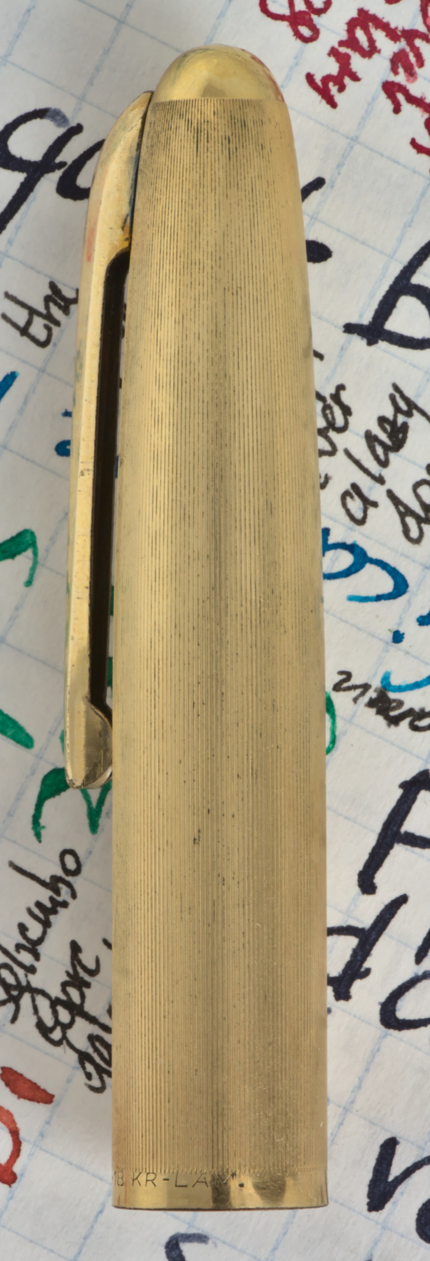 Foto di una penna Soffer. Caricamento a stantuffo. Realizzazione in celluloide trasparente a righe verdi. Dettaglio del cappuccio. Modello ignoto a pennino coperto con cappuccio laminato oro.