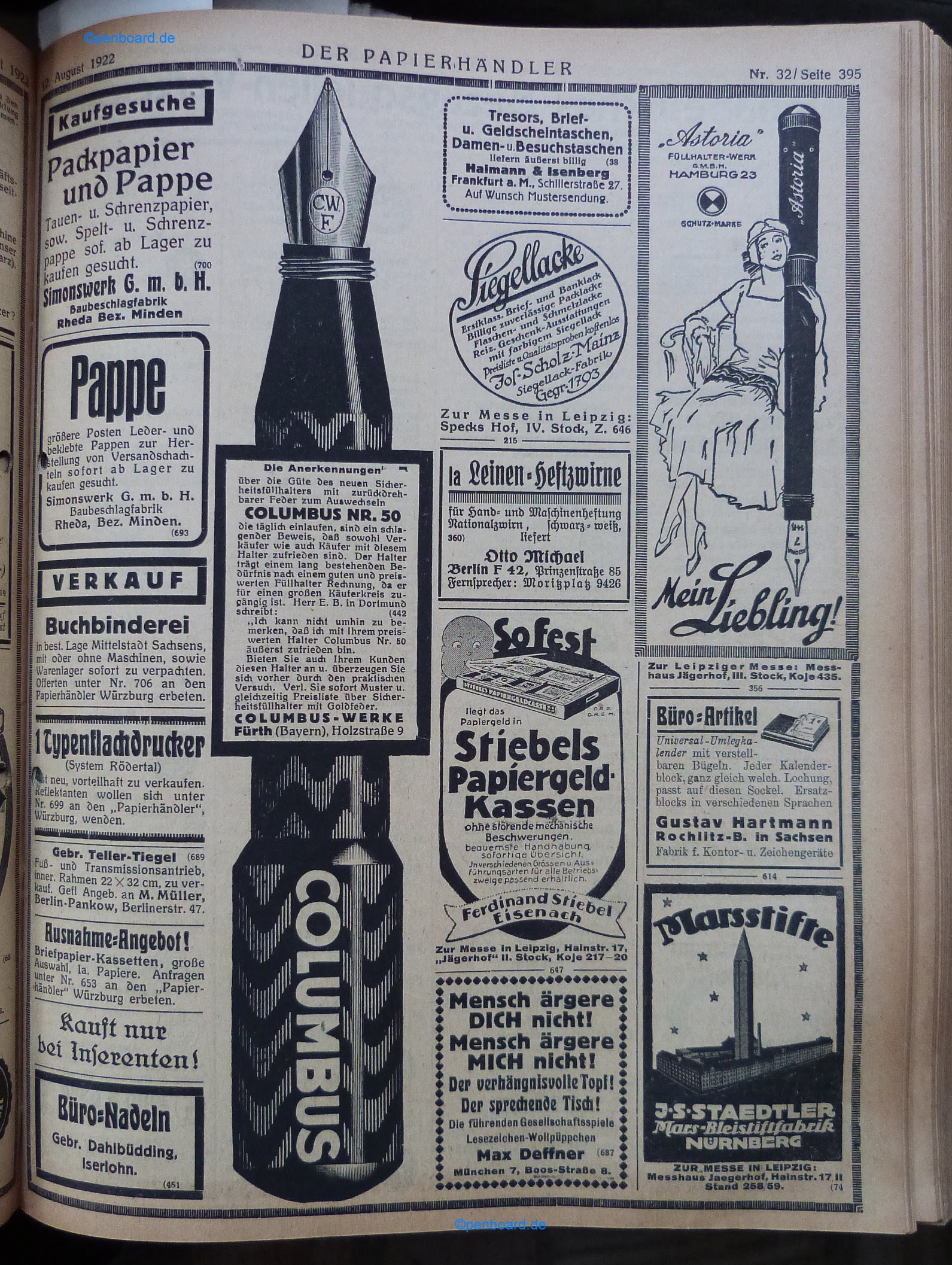 Scansione di una pubblicità datata 1922-08-12. Pubblicazione su: Der Papierhändler - Fachblatt Schreibwaren für Papier u. Büro-Bedarf, n. 32, pag. 395. Contributo di Tom Westerich, https://www.penboard.de. Data visibile direttamente. Pagina di pubblicità varie per articoli di cancelleria (fra cui le matite Marsstifte della Staedtler) con due riquadri concernenti penne stilografiche, una pubblicità Astoria per una rientrante Astoria No. 7 ed una pubblicità Columbus-Werke che mostra il modello Columbus Nr. 50.