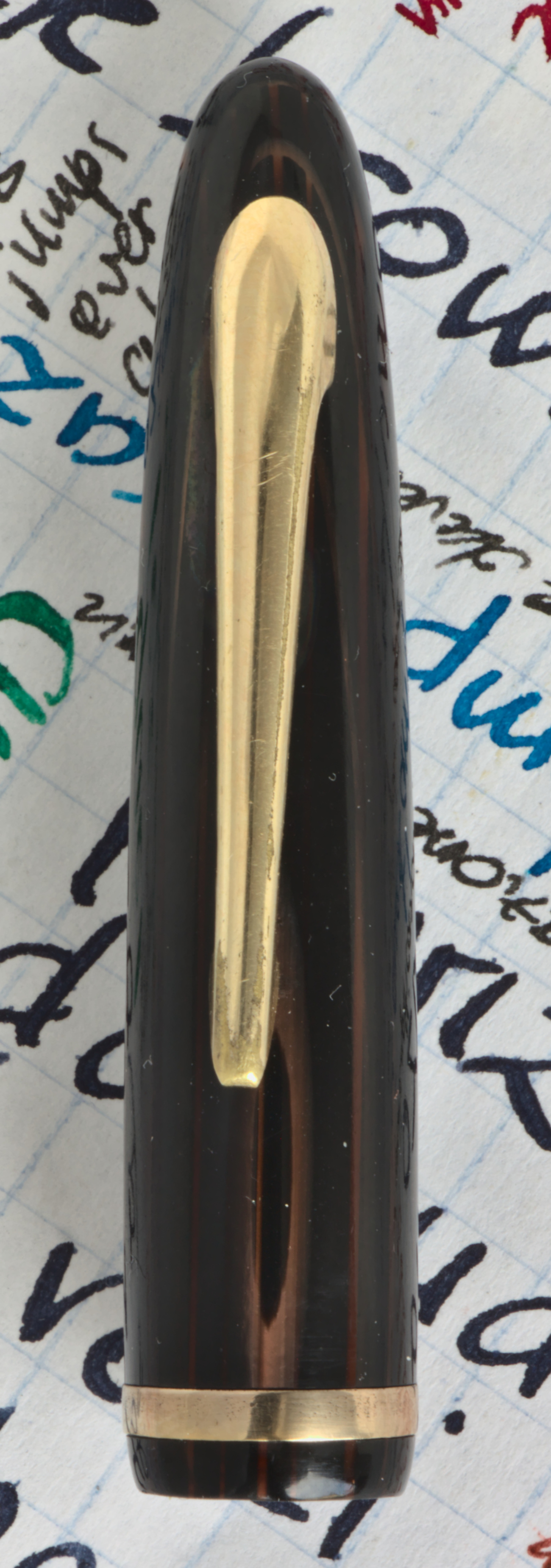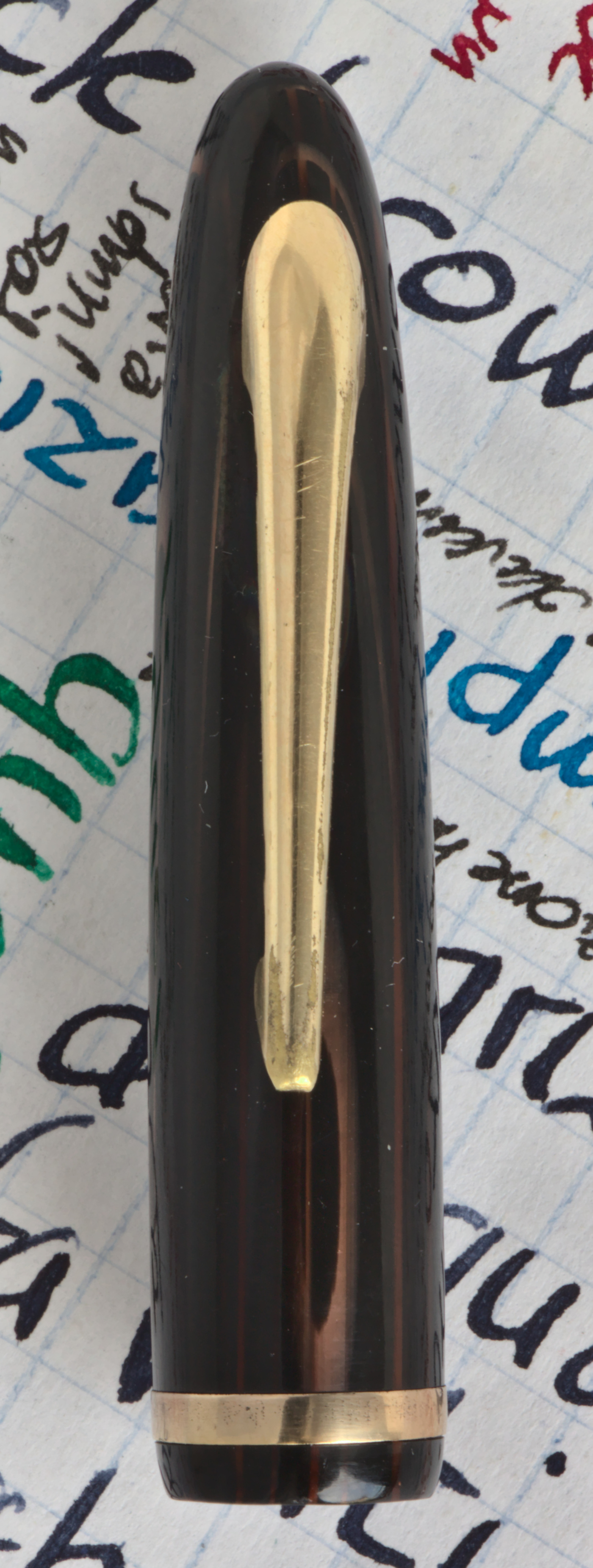 Foto di una penna Tibaldi. Modello: Tibaldi Lady. Caricamento a stantuffo. Realizzazione in celluloide arco rossa. Dettaglio del cappuccio. Modello con pennino aperto, marcata "D-8393".