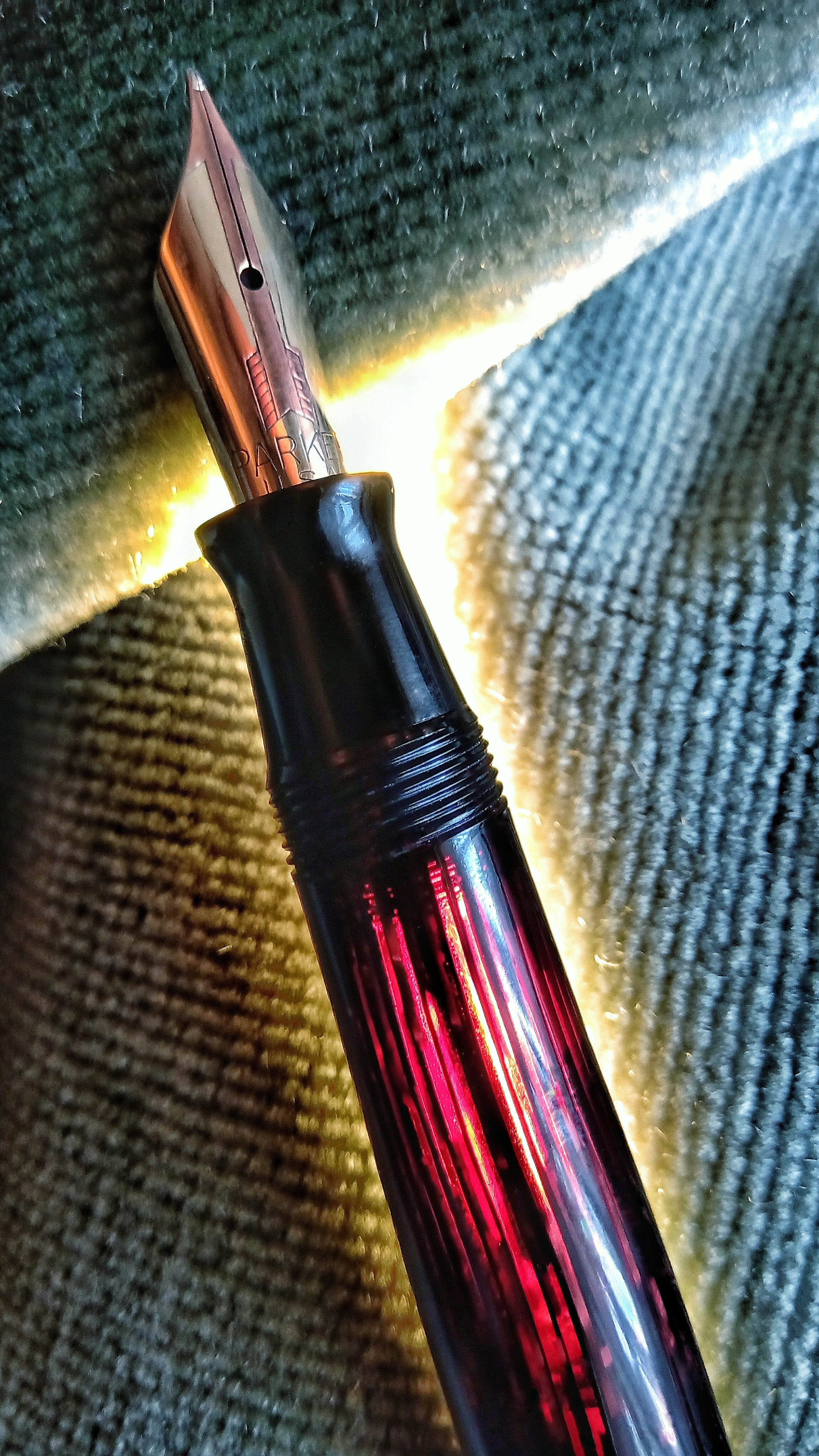 Foto di una penna Parker. Modello: Vacumatic Shadow Wave. Caricamento vacumatic. Realizzazione in celluloide a righe rosse. Versione Senior. Contributo di Gustavo, (utente forum gfrico2000).