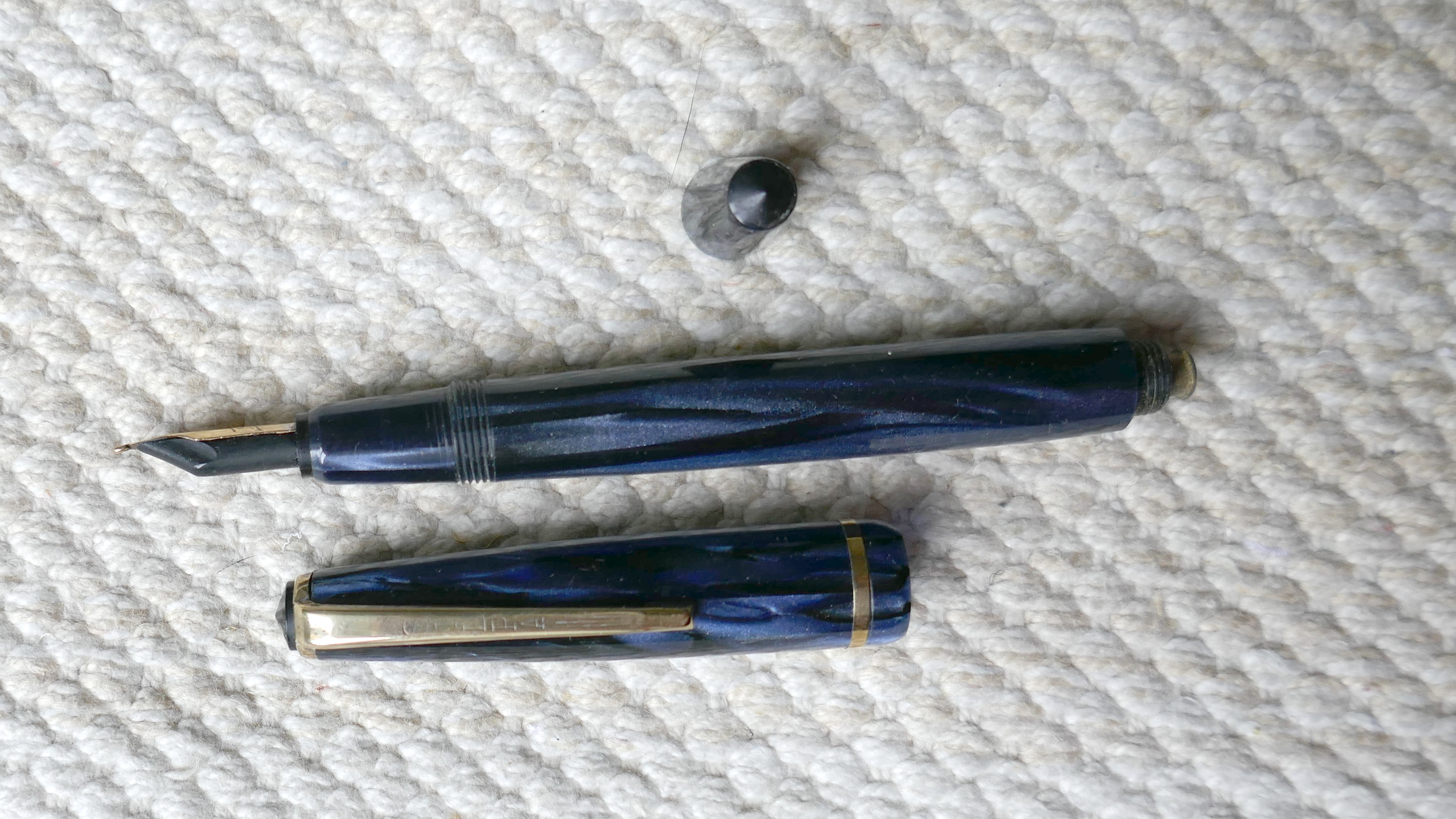 Photo of a pen produced by Silpa. Filling system: button filler. In striated blue celluloid. Unknown model.