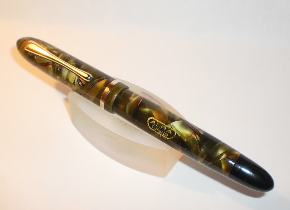 Photo of a pen produced by Alba. Filling system: button filler. In marbled green with silver string celluloid.
