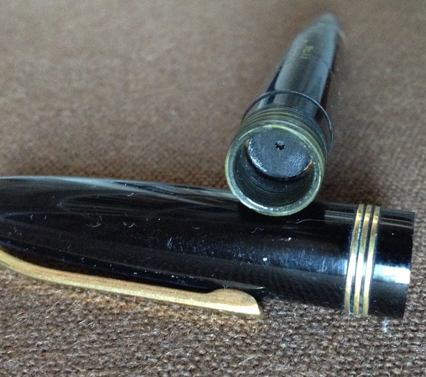 Foto di una penna Alfa-Ro (un marchio della Roccati). Caricamento a stantuffo. Realizzazione in celluloide anellata verde. Dettaglio del caricamento. Modello marcato "Extra", cappuccio nero. Contributo di Paolo (utente forum PG1964TO).