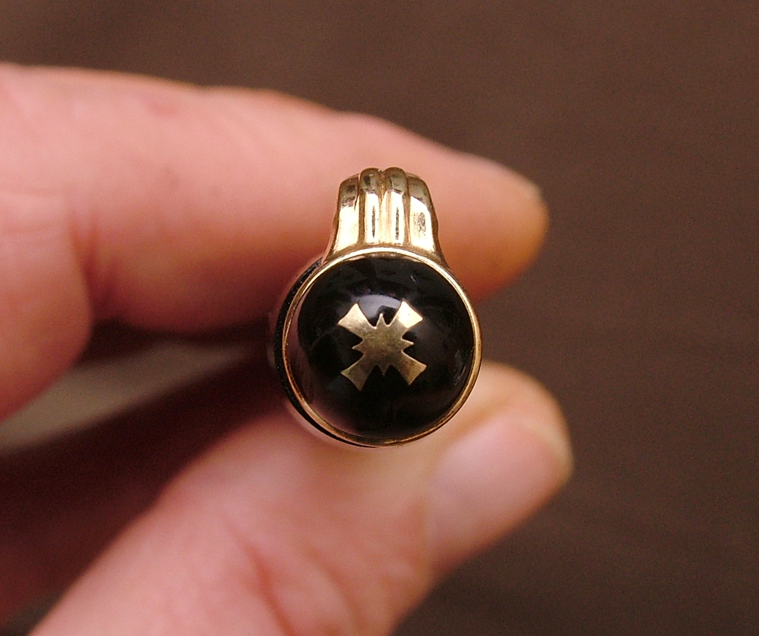 Photo of a pen produced by Aristokrat. Model: Aristokrat 20. Filling system: piston filler. In black plastic resin. Detail of cap head. School model, templar cross logo, marked "Räuchle & Co.".
