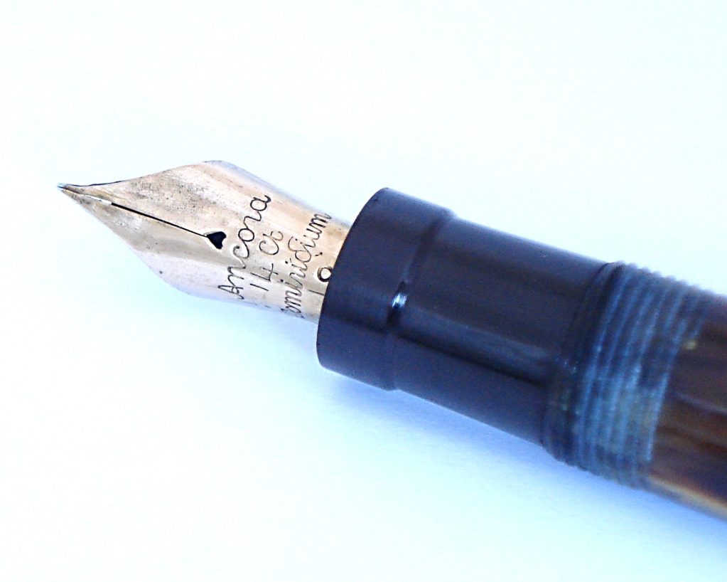 Foto di una penna Ancora. Modello: Ancora Flat-top. Caricamento a pulsante di fondo. Realizzazione in celluloide striata marrone. Misura piccola Contributo di Fabio (utente forum fountainpen.it fabbale09).