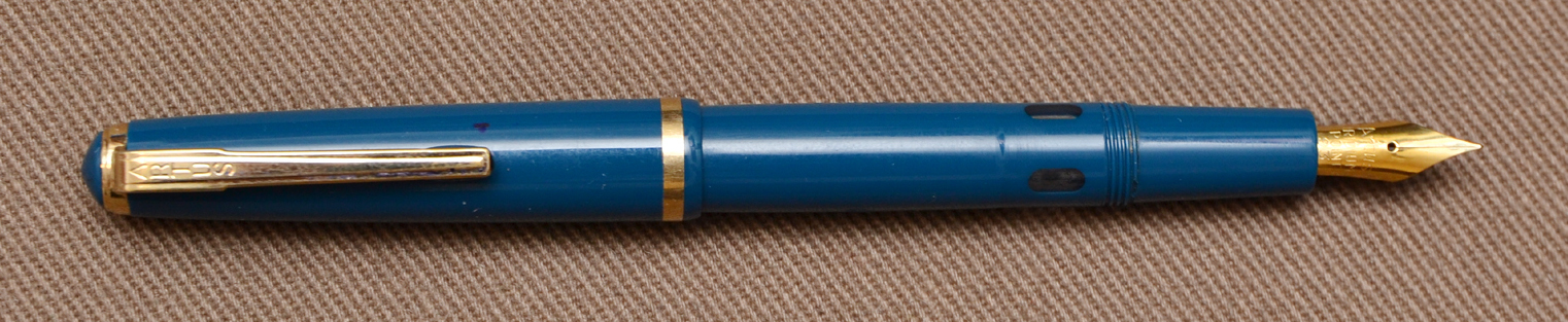 Photo of a pen produced by Artus (a Lamy trademark). Model: Artus 41. Filling system: piston filler. In azure plastic resin.