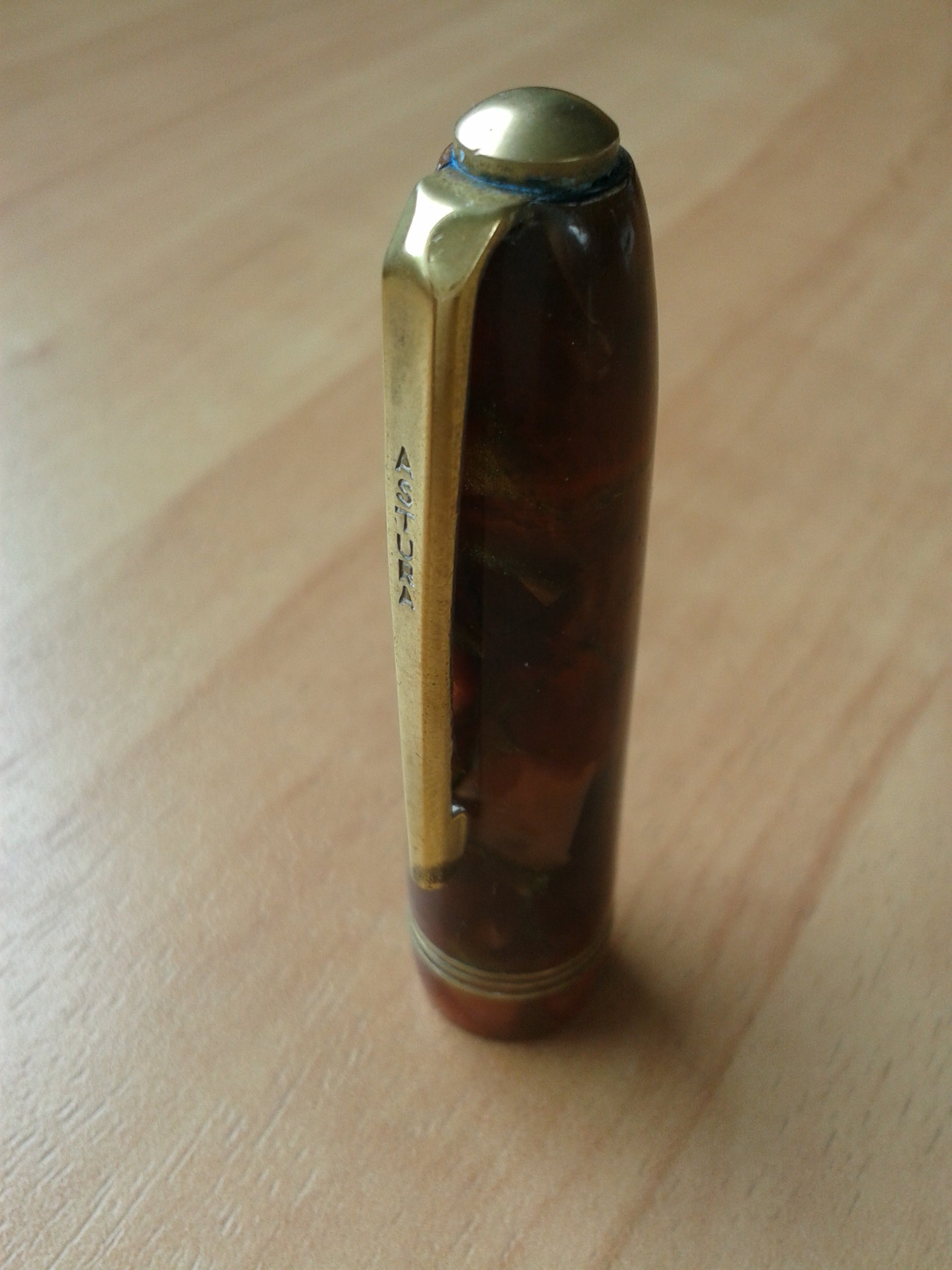 Foto di una penna Astura (sottomarca Società Anonima Fabbrica Italiana Stilografiche). Modello: Astura Nova. Caricamento a pulsante di fondo. Realizzazione in celluloide rossa e verde oro. Dettaglio del cappuccio. Contributo di Giorgio (utente forum Musicus).