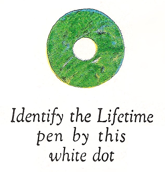 | − | @it|Estratto dalla [[:File:LifeTime-JadeGreen | + | @it|Estratto dalla [[:File:1927-03-LifeTime-JadeGreen.jpg|scansione]] di una pubblicità della [[Sheaffer]] del 1927 che illustra il marchio di garanzia a vita ''[[White dot]]''. |