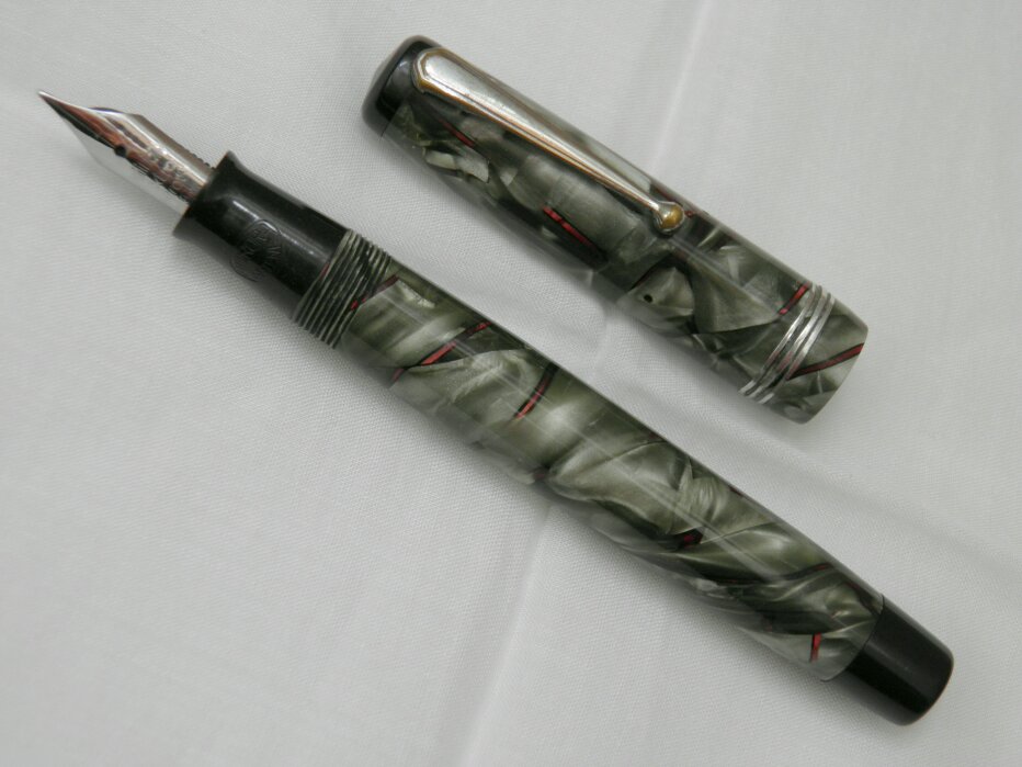 Foto di una penna Aurora. Modello: Selene. Caricamento a pulsante di fondo. Realizzazione in celluloide grigia marmorizzata. Seconda serie. Contributo di Ambros (utente forum Ambros5).