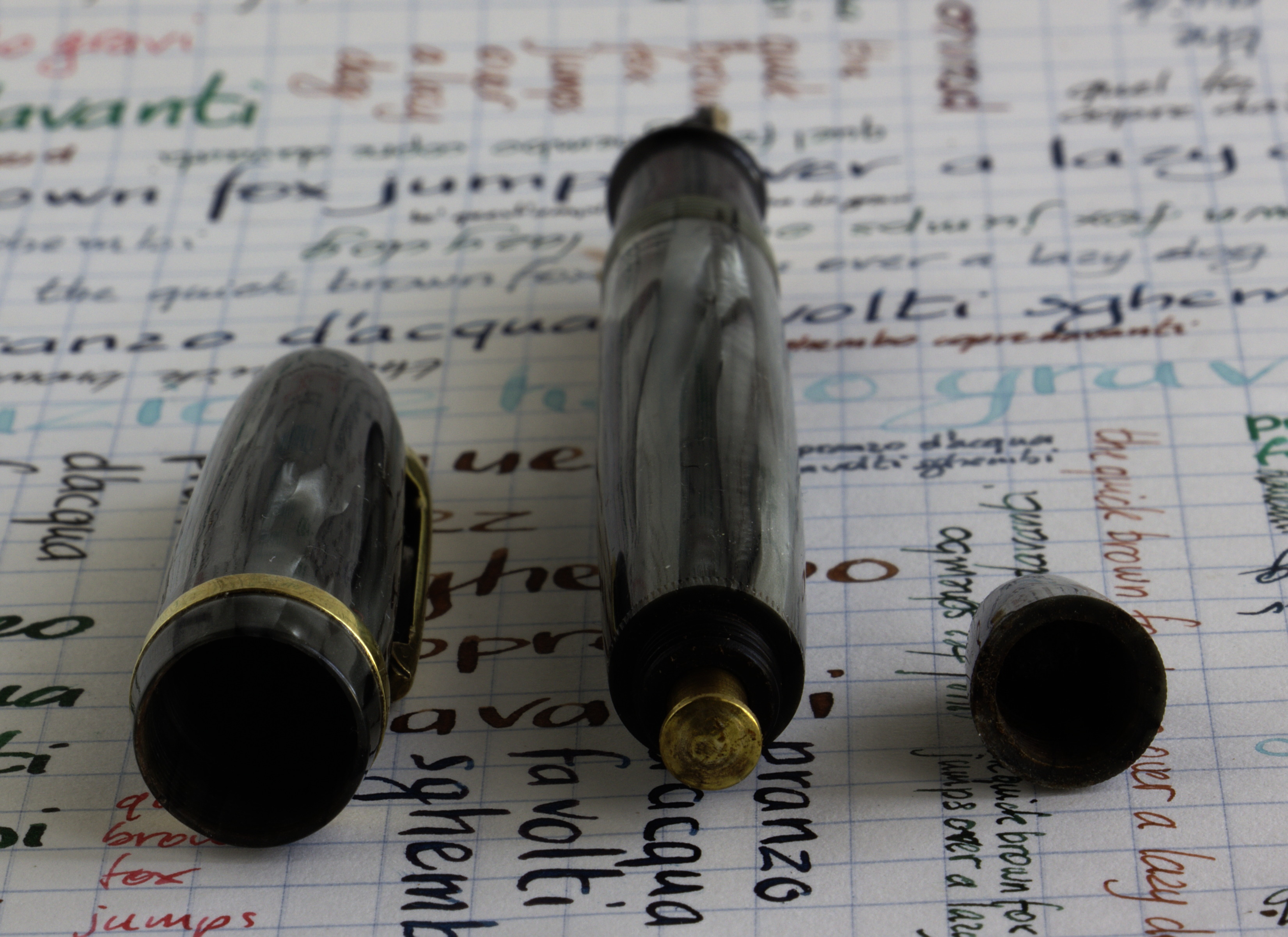 Photo of a pen produced by Aviostyl (a Giacomazzi trademark). Filling system: button filler. In striated gray celluloid. Streamlined style model, single band.