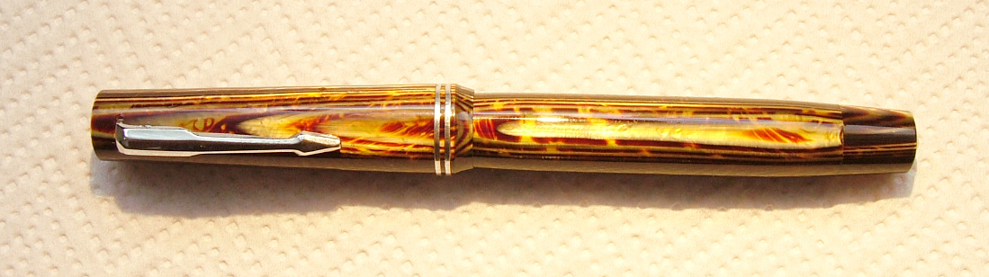 Foto di una penna Columbus. Modello: Columbus 36. Caricamento a pulsante di fondo. Realizzazione in celluloide arco marrone chiaro. Misura grande. Contributo di Massimo (utente forum maxpop55).