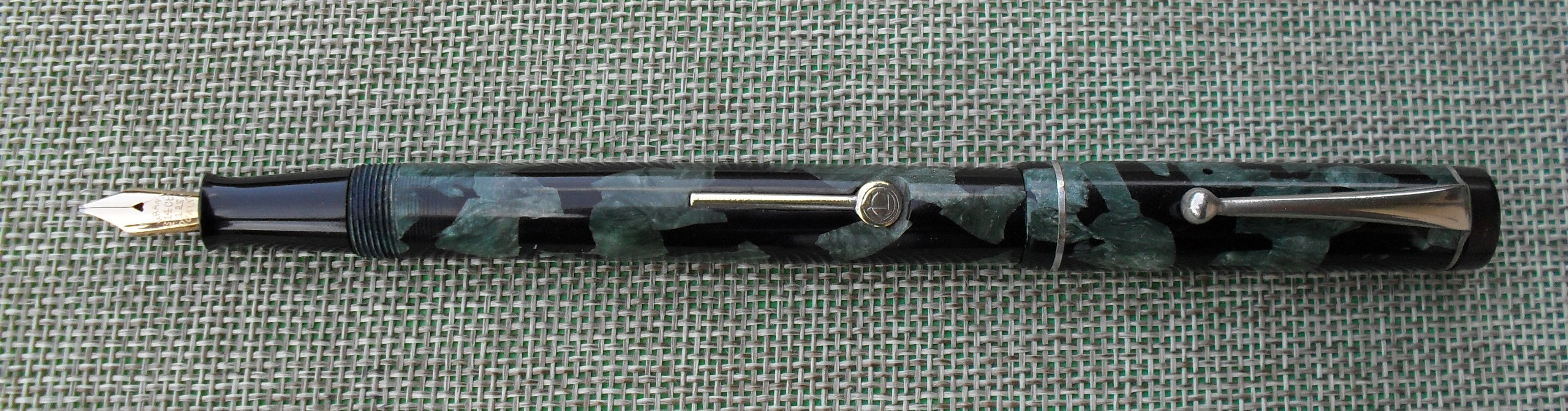 Photo of a pen produced by Curzons (a Lang - Curzon - Summit trademark). Model: Summit S.65. Filling system: lever filler. In marbled blue celluloid. Second version of the model (called mk2) still marked Curzons. With the imprint Unbreakable, referring to celluloid.