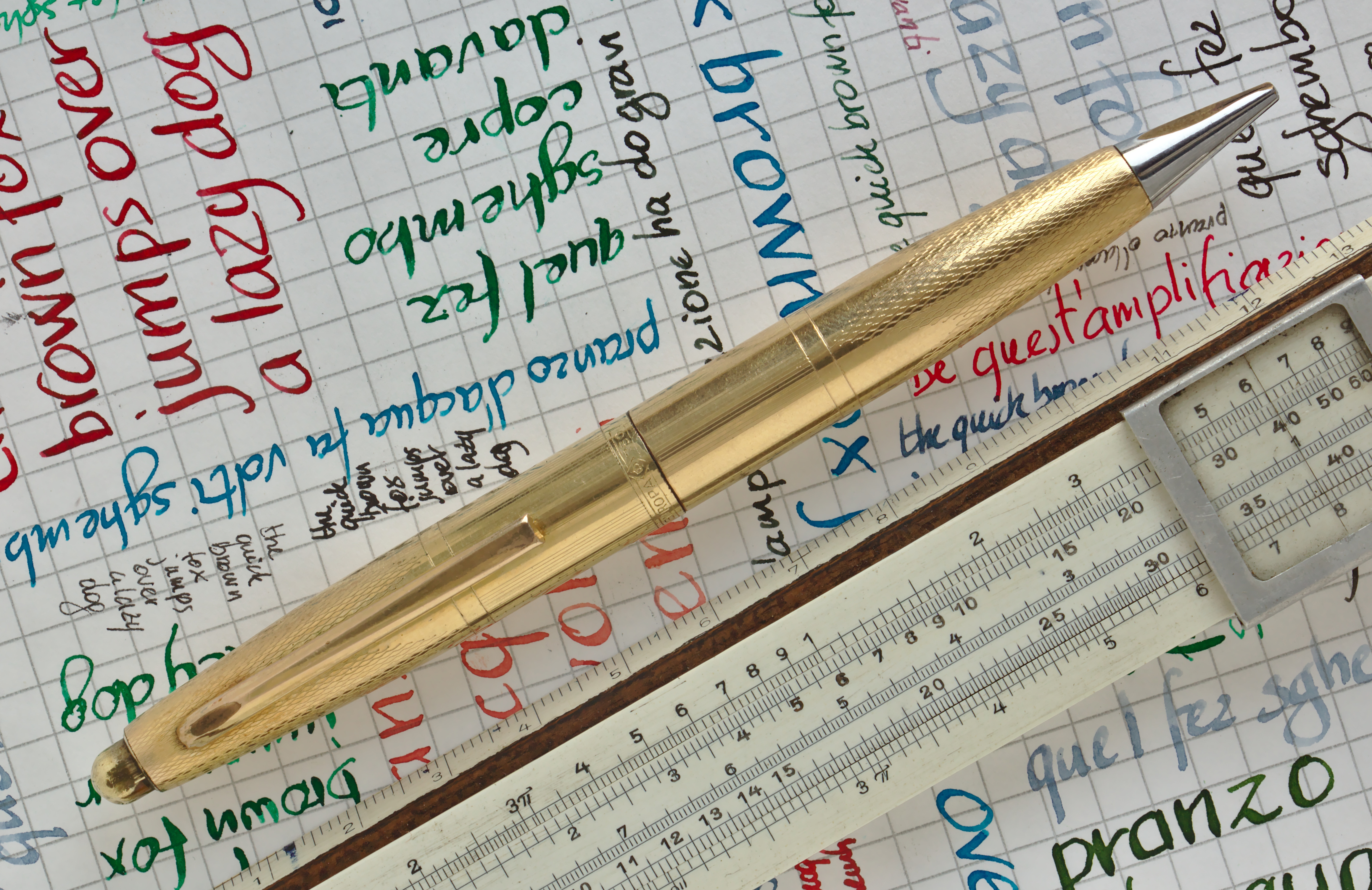 Photo of a pencil produced by Europa. With a geometric pattern gold rolled overlay. Postwar production.
