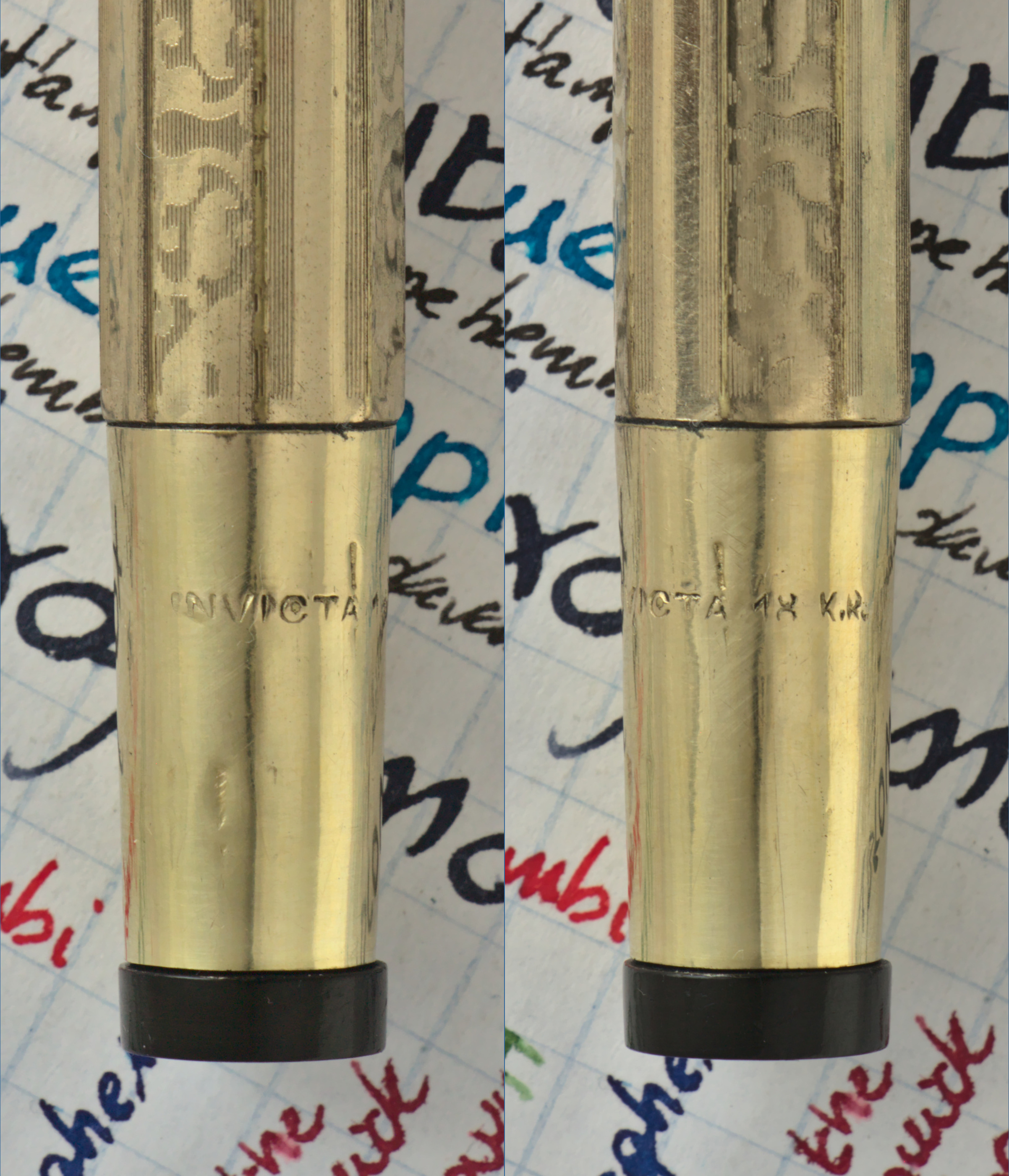 Foto di una penna Invicta. Caricamento rientrante. Realizzazione con rivestimento laminato sfaccettato con facce alternate liscie ed arabescate. Dettaglio del fondello. Dettaglio della stampigliatura. Dettaglio della punzonatura. Pennino non originale, marcatura "18 K.R." della laminatura e del nome sul fondello.