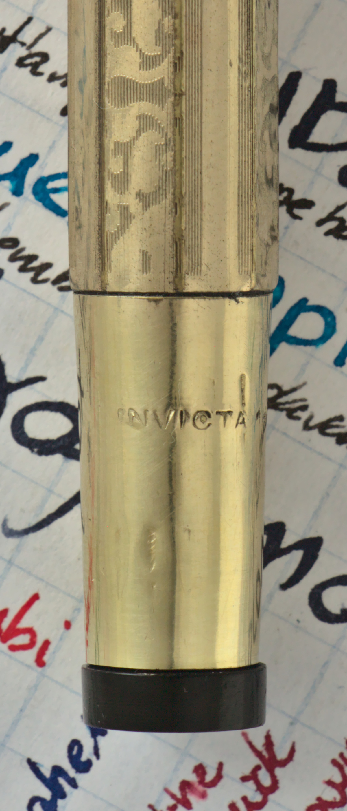 Foto di una penna Invicta. Caricamento rientrante. Realizzazione con rivestimento laminato sfaccettato con facce alternate liscie ed arabescate. Dettaglio del fondello. Dettaglio della stampigliatura. Pennino non originale, marcatura "18 K.R." della laminatura e del nome sul fondello.