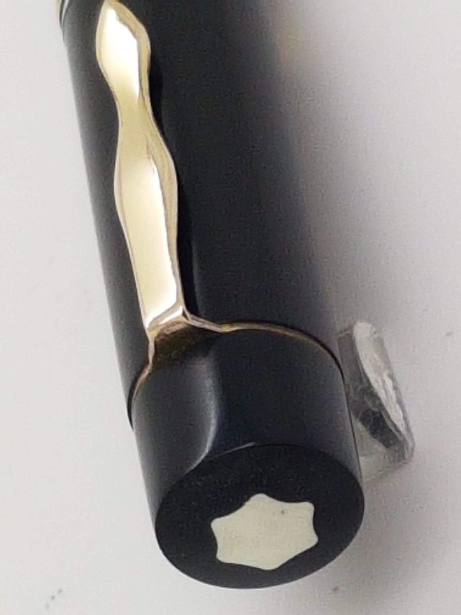Foto di una penna Montblanc marcata "fabbricata in Germania". Modello: Montblanc 139. Caricamento a stantuffo. Realizzazione in celluloide nera. Dettaglio della testa del cappuccio. Versione con pennino in acciaio e finestra lunga. Contributo di Fabio (utente forum fountainpen.it fabbale09).