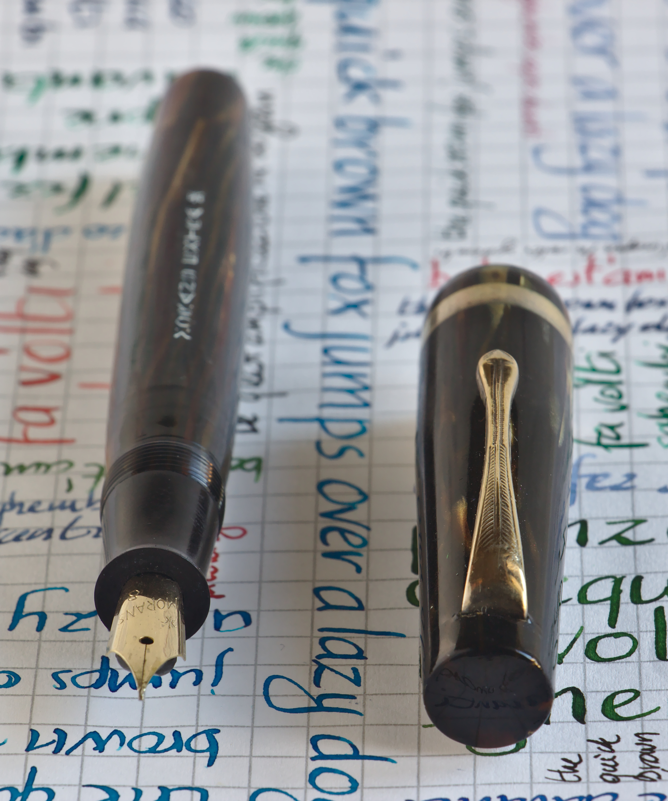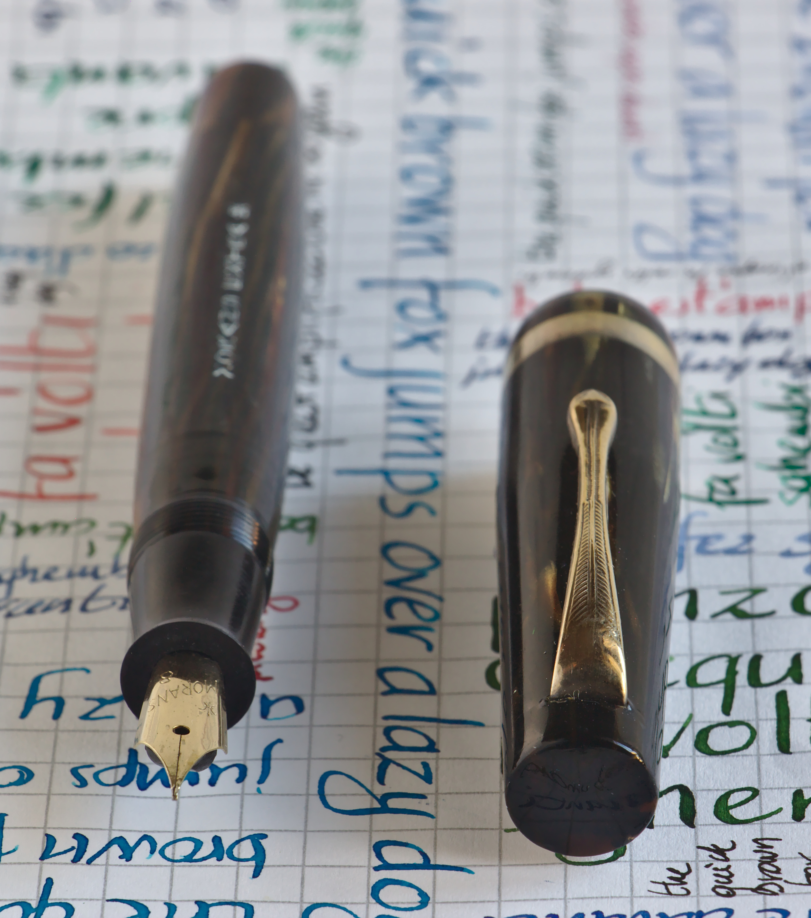 Foto di una penna Morans. Caricamento a pulsante di fondo. Realizzazione in celluloide striata marrone. Pennino n. 8 dorato.