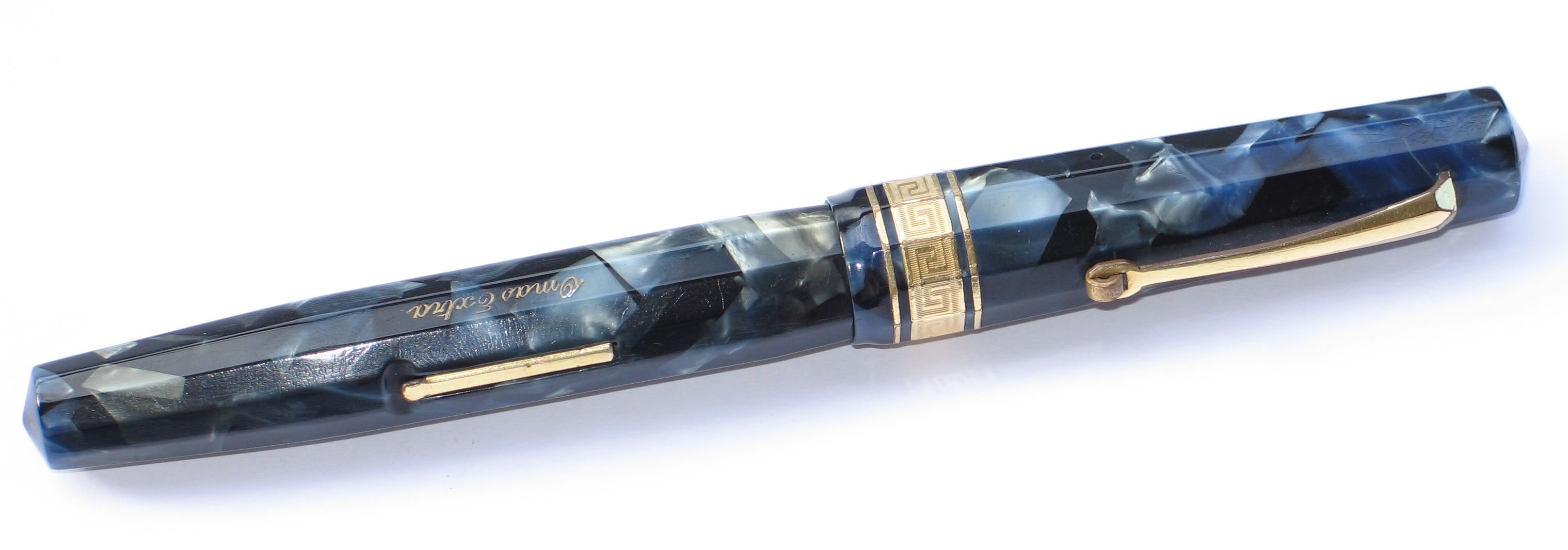 Photo of a pen produced by Omas. Model: Omas Extra. Filling system: lever filler. In marbled blue celluloid. Big size. Faceted greek band version.