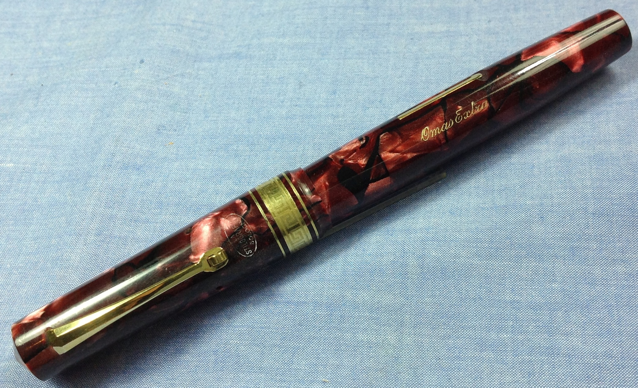 Foto di una penna Omas marcata ""La Stilografica Bologna"". Modello: Omas Extra. Caricamento a levetta. Realizzazione in celluloide marmorizzata rossa. Misura media. Versione tonda con vera grecata. Riconducibile alla produzione effettuata per conto della Germano, titolare del suddetto negozio e del marchio For Ever. Contributo di Massimo, utente forum Maxpen2012.
