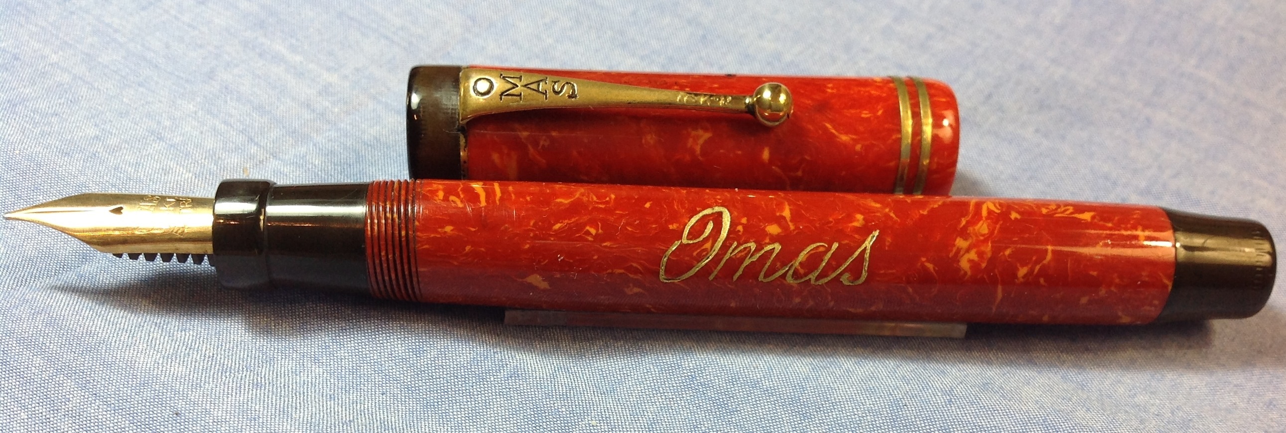 Foto di una penna Omas. Modello: Omas Tipo Duofold. Caricamento a pulsante di fondo. Realizzazione in celluloide corallo. Modello in stile Duofold. Contributo di Massimo, utente forum Maxpen2012.