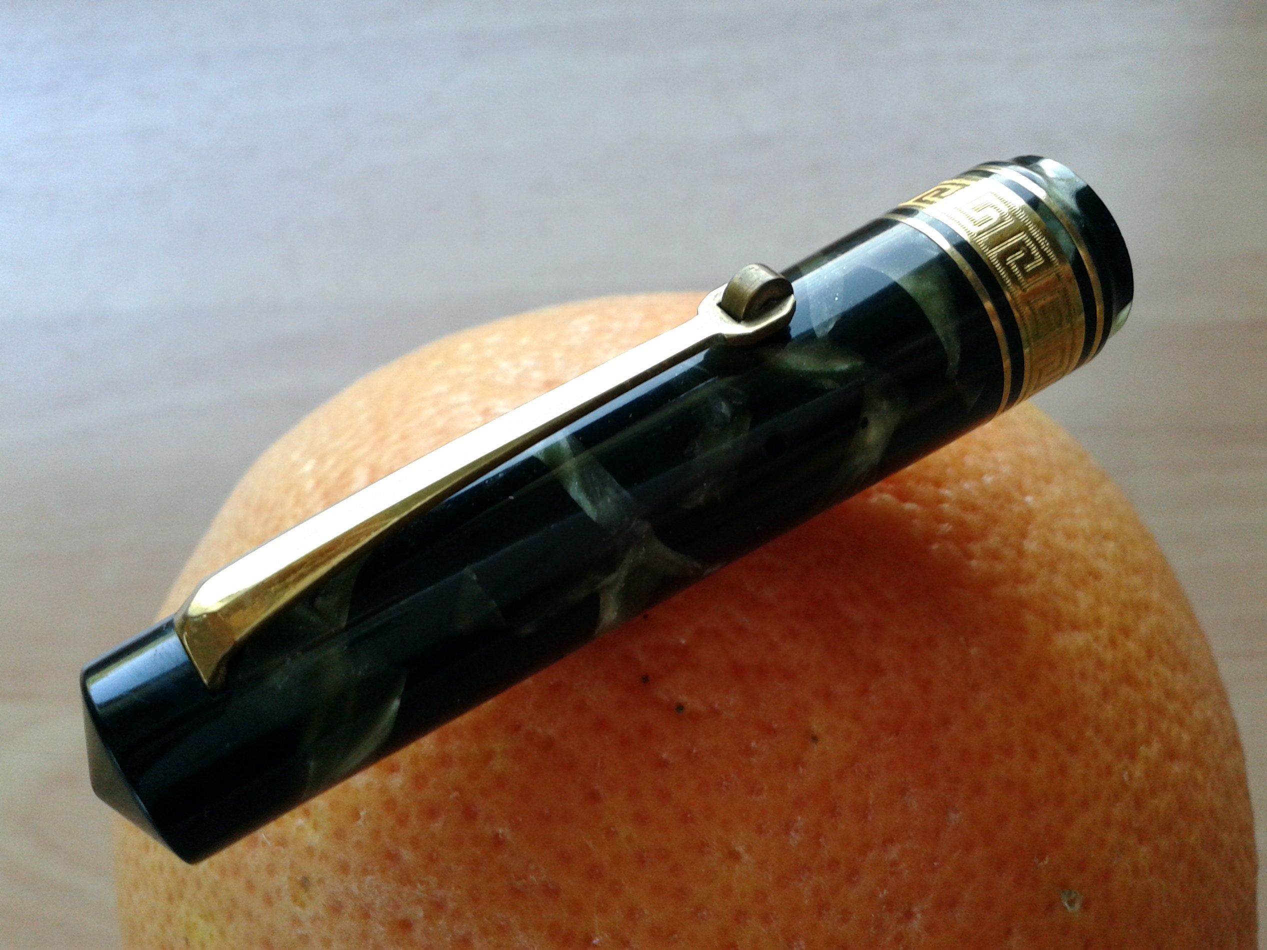Foto di una penna Omas. Modello: Lucens. Caricamento a stantuffo tuffante. Realizzazione in celluloide verde marmorizzato. Dettaglio del cappuccio. Misura media, prima variante con vera grecata ed anellini di contorno. Riporta stampigliato il brevetto nº IT-73725-1936. Contributo di Giorgio (utente forum Musicus).