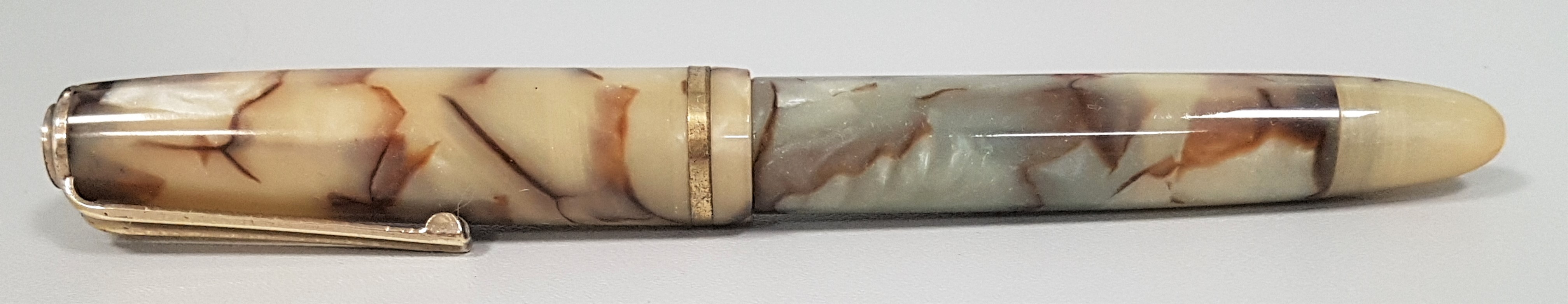 Foto di una penna Opal. Caricamento a contagocce. Realizzazione in celluloide perla venata rossa. Modello sconosciuto. Contributo di Walter (utente forum Wall).
