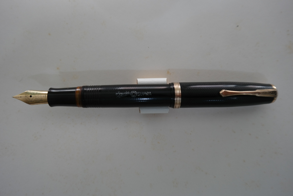 Photo of a pen produced by Osmia. Model: Osmia Supra 48. Filling system: piston filler. In black chased celluloid. Maximum size.