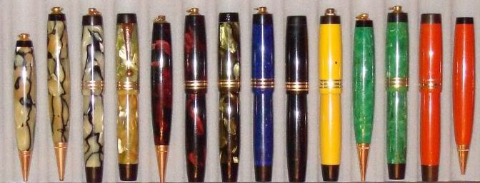 Photo of a series of pens produced by Parker. Model: Duofold. Filling system: button filler. In celluloid. All colors of the vest pocket size.