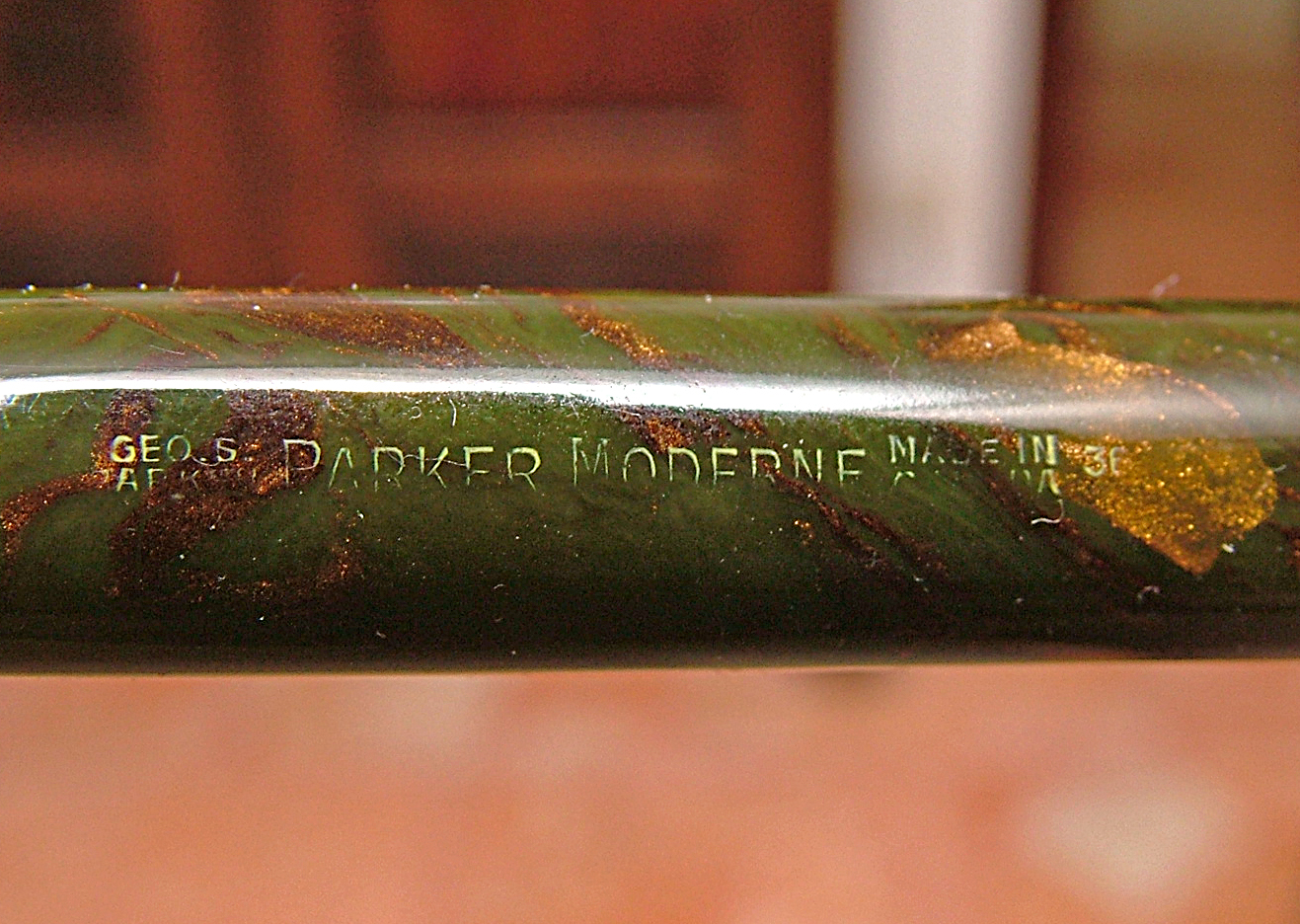 Foto di una penna Parker. Modello: Parker Moderne. Caricamento a pulsante di fondo. Realizzazione in celluloide verde con inserti bronzo. Dettaglio della stampigliatura. Uno dei modelli che vanno sotto il nome generico di "Depression era pen". Contributo di Massimo (utente forum maxpop55).