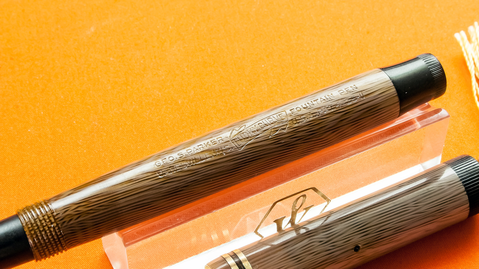 Foto di una penna Parker. Modello: Pastels. Caricamento a pulsante di fondo. Realizzazione in celluloide moiré marrone chiaro (Beige Gray). Dettaglio della stampigliatura. Versione da signora con anellino sul cappuccio e veretta nera con anelli dorati esterni. Riporta stampigliato sul corpo un riferimento al brevetto nº US-990288. Contributo di muristenes (utente forum muristenes).