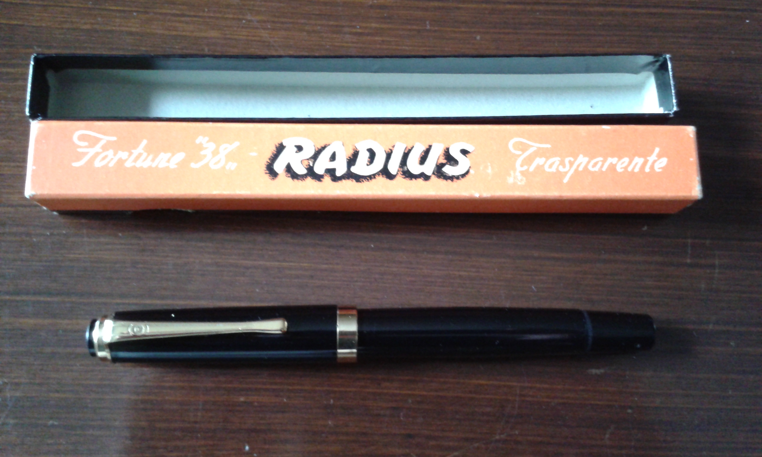 Foto di una penna Radius (sottomarca Società Anonima Fabbrica Italiana Stilografiche). Modello: Fortune 38. Caricamento a stantuffo. Realizzazione in resina plastica nera. Versione del dopoguerra, somigliante alla Pelikan 400. Contributo di Antonio (utente forum fockerwulf).