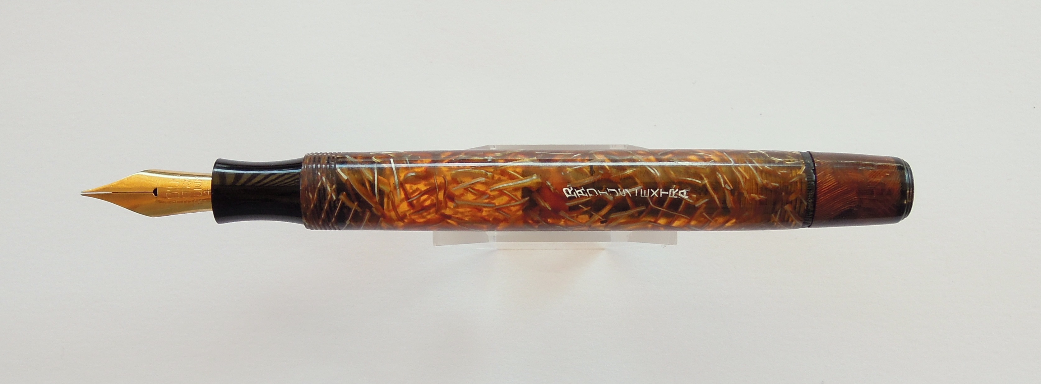 Foto di una penna Radius (sottomarca Società Anonima Fabbrica Italiana Stilografiche). Modello: Radius Extra. Caricamento a levetta. Realizzazione in celluloide trasparente aghi di pino rossa. Versione tonda. Contributo di Roberto Vetrugno (utente forum.fountainpen.it roberto v).