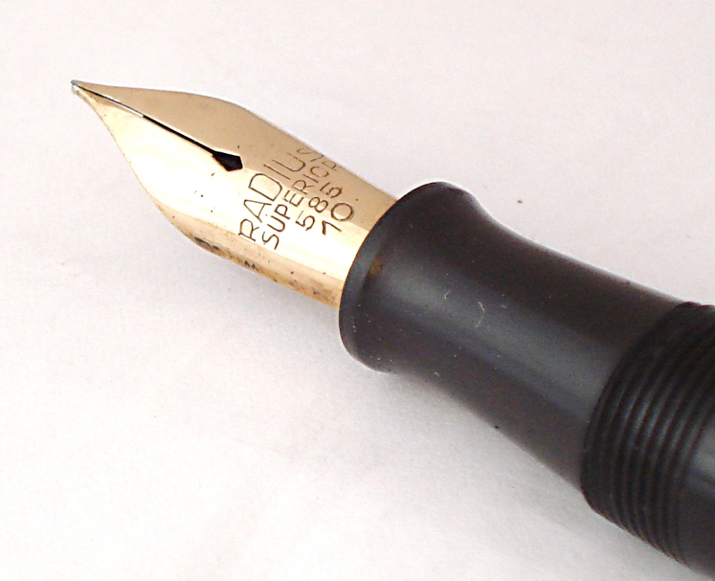 Foto di una penna Radius (sottomarca Società Anonima Fabbrica Italiana Stilografiche). Modello: Radius Superior. Caricamento a levetta. Realizzazione in celluloide nera. Dettaglio del pennino. Versione sfaccettata. Contributo di Fabio (utente forum fountainpen.it fabbale09).
