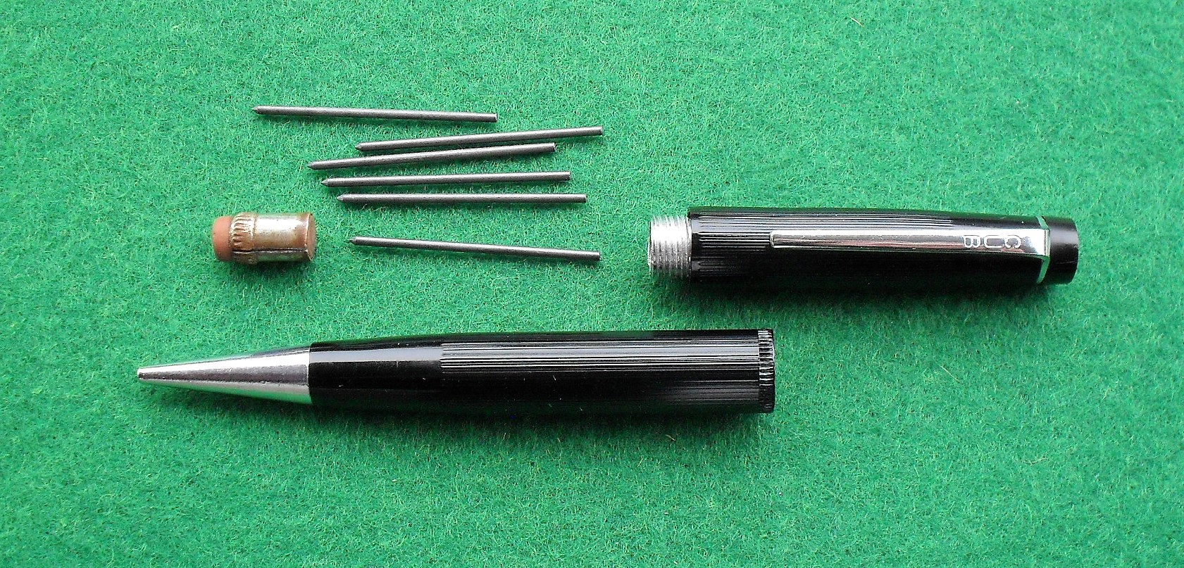 Foto di una matita meccanica Summit (un marchio della Lang - Curzon - Summit). Modello: Summit S.85. Realizzazione in celluloide nera rigata. Modello economico per studenti, denominato anche "Cub". Contributo di Alberto (utente forum A Casirati).