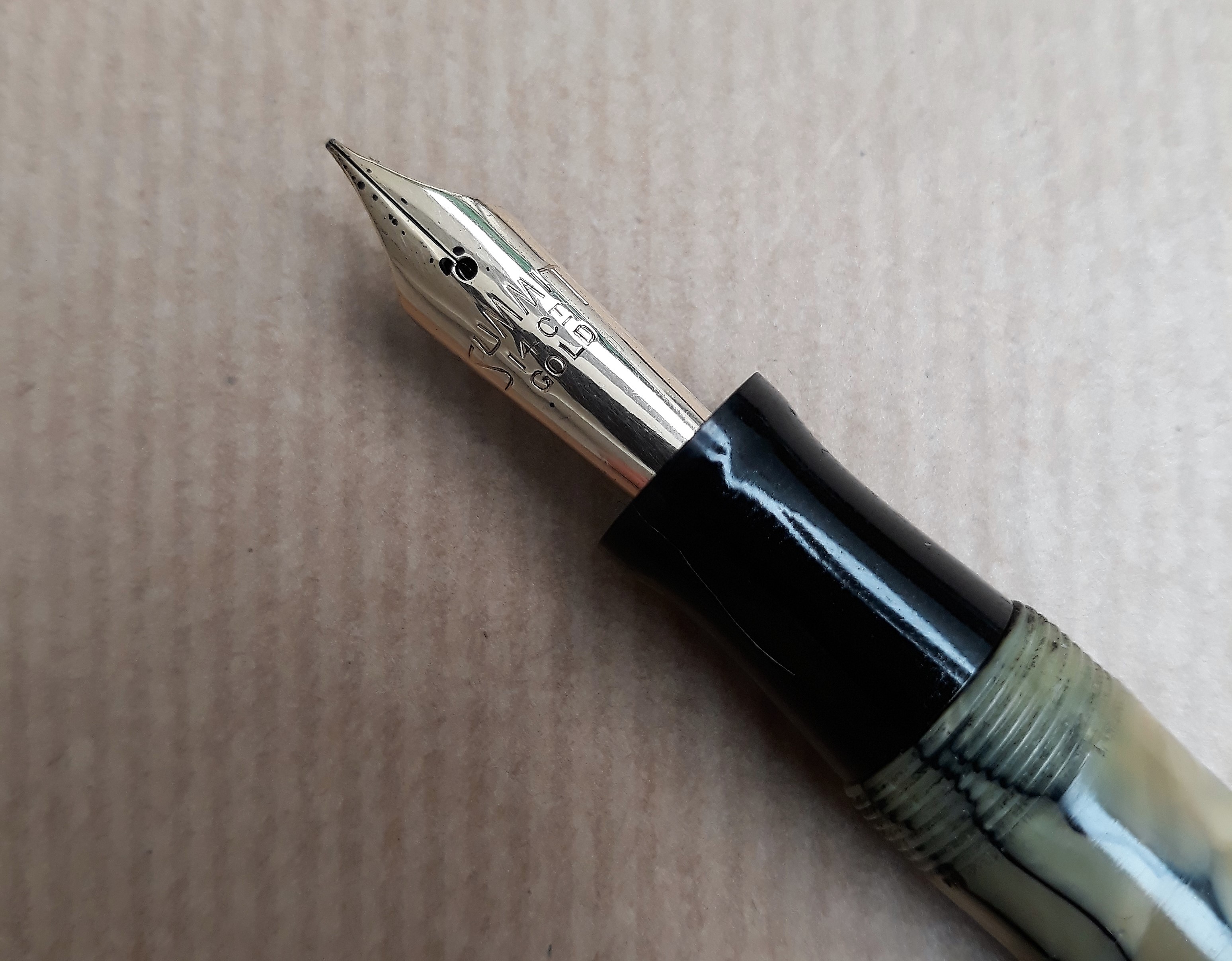 Foto di una penna Summit (un marchio della Lang - Curzon - Summit). Modello: Summit S.121. Caricamento a levetta. Realizzazione in celluloide perla venata nera. Dettaglio del pennino. Contributo di Alberto (utente forum A Casirati).