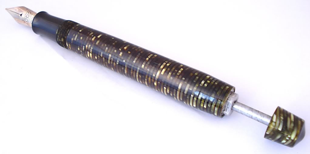 Photo of a pen produced by Tabo (a Stiassi e Tantini trademark). Model: Tabo Trasparente. Filling system: vacumatic-like. In ringed green/brown celluloid. Version with flat arrow clip, cap band within rings. Big size.