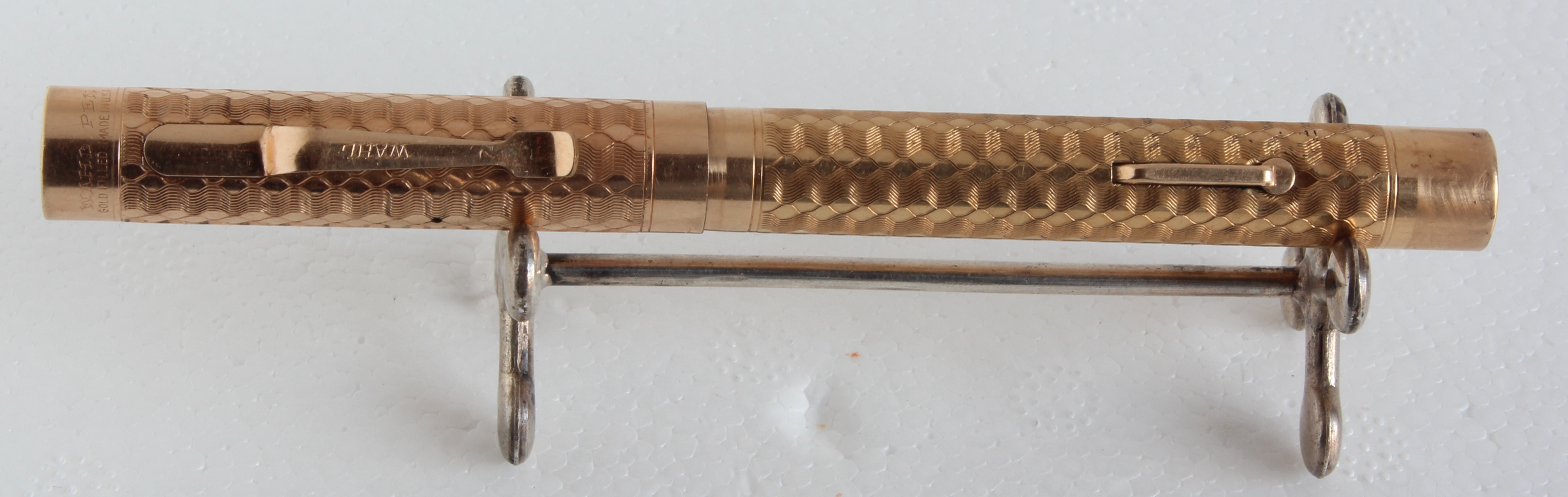 Foto di una penna Eversharp. Modello: Wahl Metal Pen. Caricamento a levetta. Realizzazione in metallo laminato oro con lavorazione guilloché. Misura grande, pennino n. 5, nella lavorazione Zigzag.