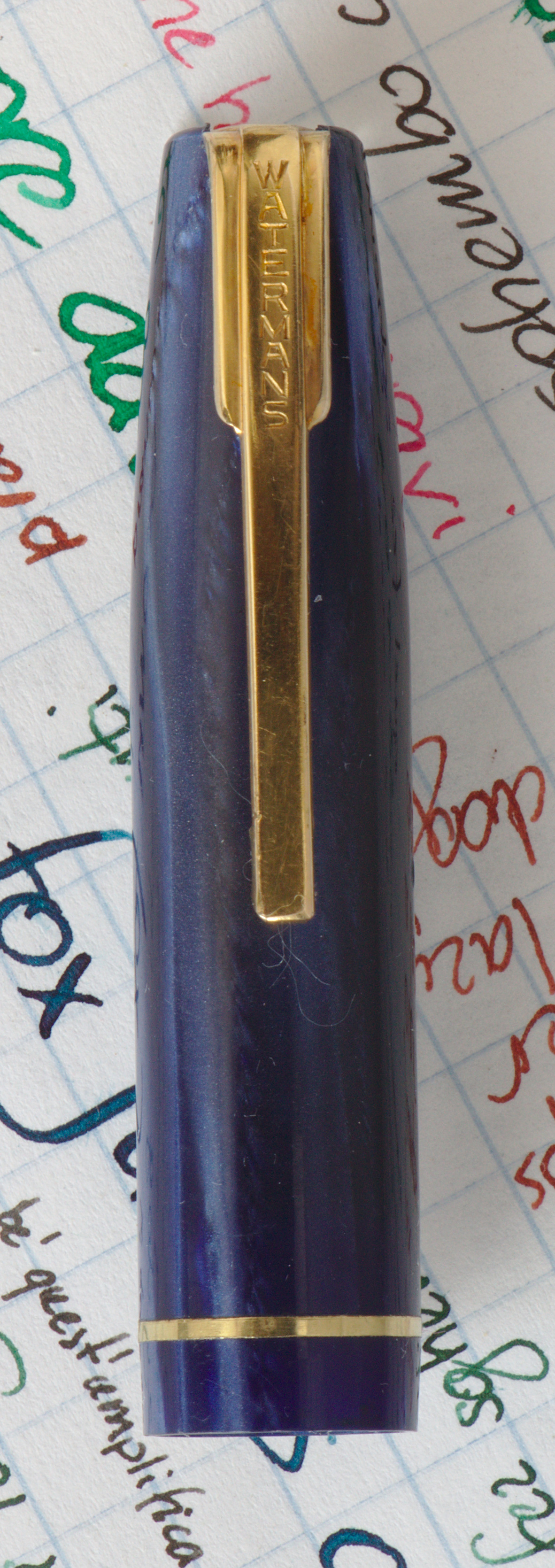 Photo of a pen produced by Waterman. Model: Dauntless. Filling system: lever filler. In striated blue celluloid. Detail of cap. English production.